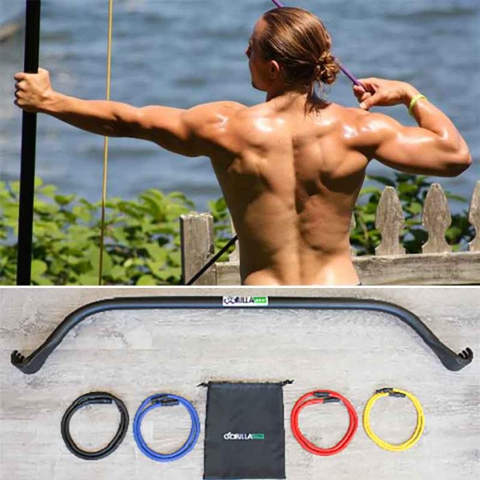 Resistance training comes via working the Gorilla Bow, a “mobile gym” that looks like it could double for archery practice. It’s made of aircraft aluminum and can handle more than 300 pounds of tension.