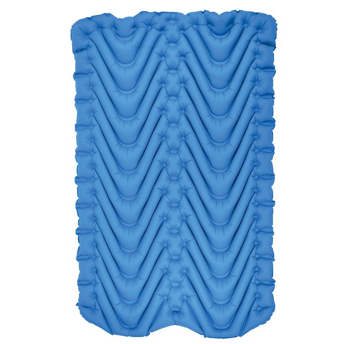 The popular Klymit Static V sleeping pad is coming in a 2-person version, the Double V. It is made to minimize movement from the person next to you and has an R value of 1.3. The big pad weighs 40.5 oz. and is sized to fit in a two-person tent.