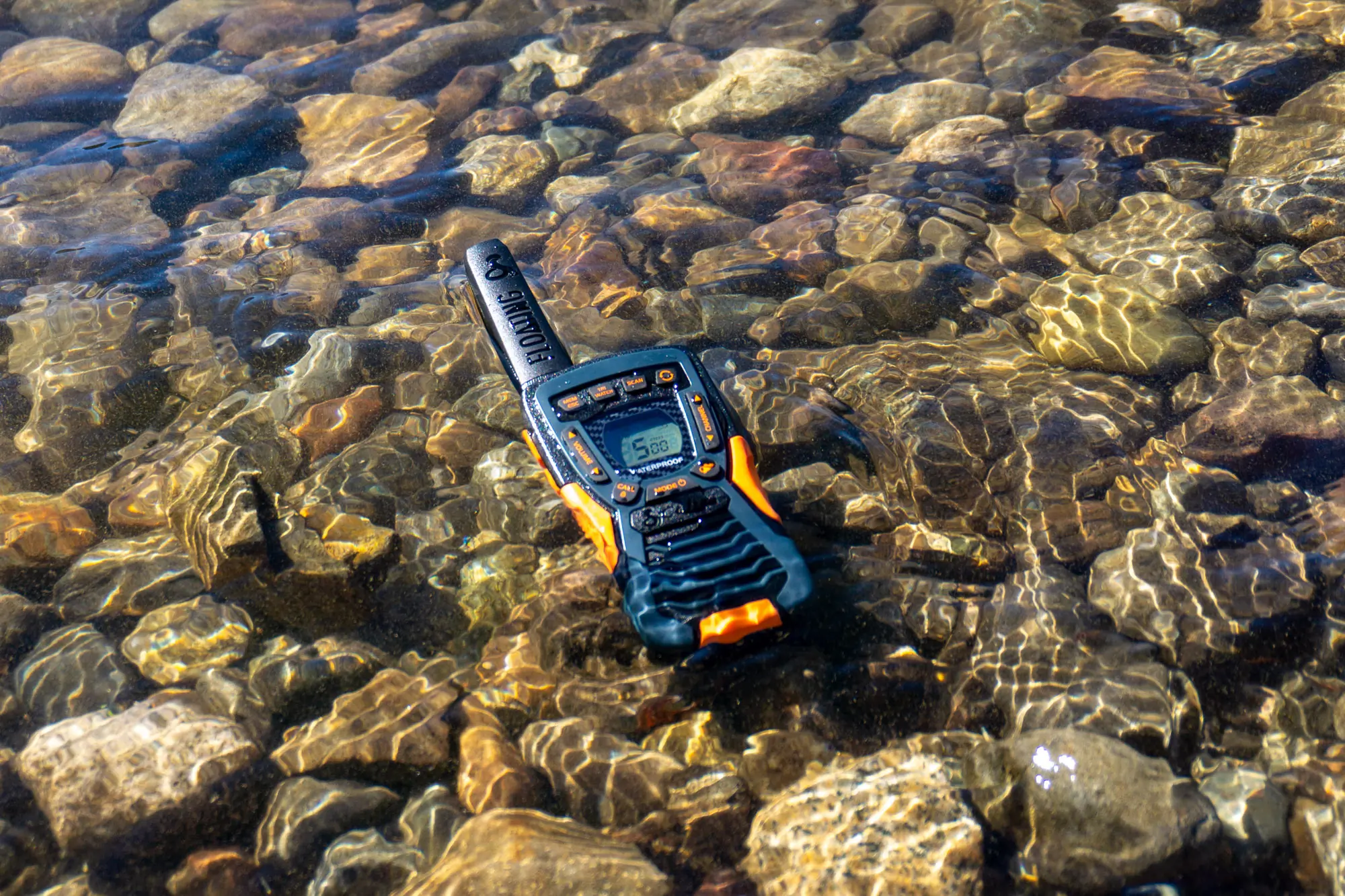 The Rocky Talkie Expedition, Cobra ACXT1035R FLT, Mountain Lab Scout, Midland GXT67 Pro, and Motorola T600 all claim IP67 waterproofing with immersion in 3 feet of water up to 30 minutes, so I chucked them in a bucket to prove it.