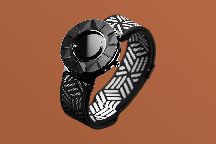 The Eone Apex Salas sport watch, announced last month, features a set of circular tracks; one in the center of the watch face indicating hours and one around the outside edge for minutes. A single ball bearing moves around each track, similar to watch hands, so wearers simply trace their fingers across the piece to tell time. The system is magnetized, which keeps the ball bearings in their respective rings, even while kicking up gravel on your bike or clipping on chains at the top of a climb.