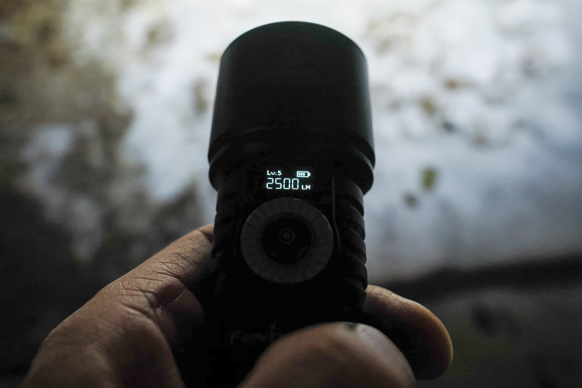 Finally, I like the LCD screen’s simple readout. Tap the power button, and it tells you the battery percentage remaining exactly. While running, it tells you the exact current lumen output, even changing the reading as the light regulates itself down due to heat. It was wild to see the light reading dial down from 2,800 to 2,600, and then 2,500, and so on, as the light also visibly dimmed during regulation.