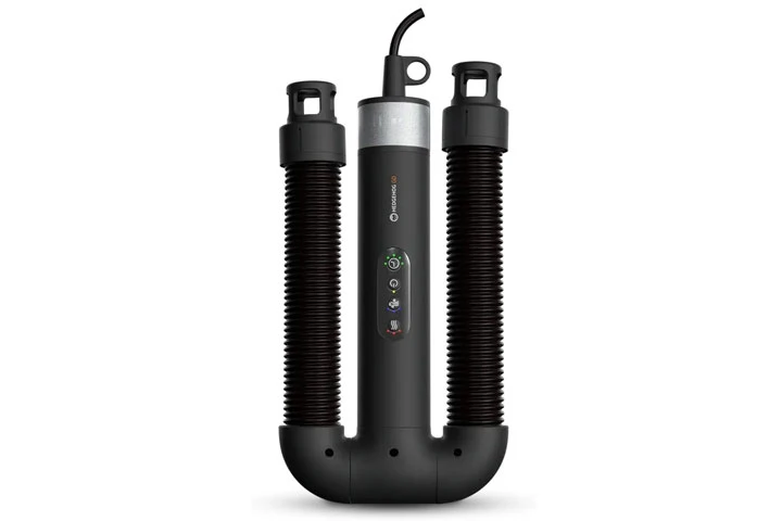 The Hedgehog GO has two attachments that are easy to interchange on the base: a motor and a fan. One attachment has two flexible and extendable hoses for drying boots, gloves, and other wet gear. The other attachment is smaller and turns the base into a regular hair dryer.