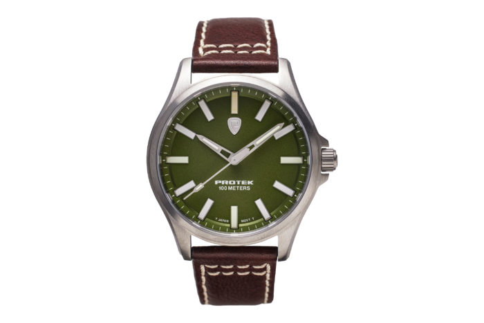 The full name of the tester shown here is the ProTek Field Series 3005. As you can see, it comes with a green dial and a brown leather strap. The face is flat, open, and free of decoration, apart from the company’s apostrophe-shaped badge and the text above and beside the 6 o’clock.