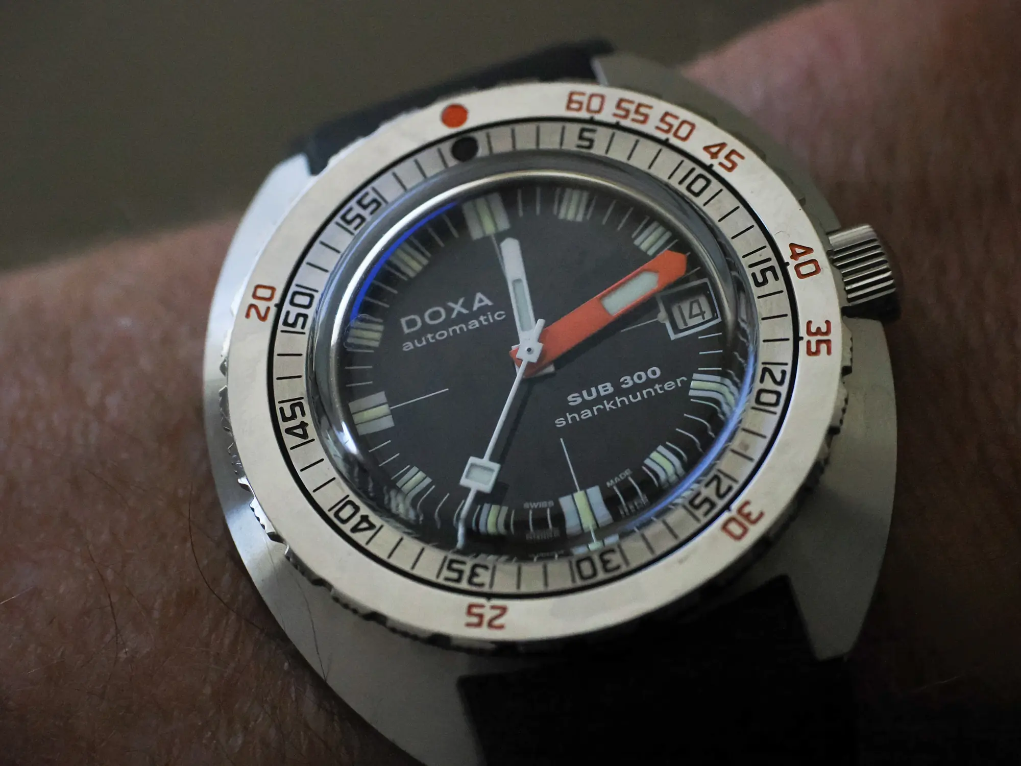 The DOXA Sub 300 Sharkhunter is a very cool-looking dive watch. Introduced in 1967 as a purpose-designed diver’s watch, it has a large case back that will lie smoothly over a neoprene wetsuit (or your bare arm).