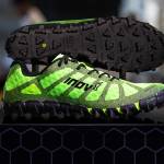 Trail running shoes showing aggressive outsole lugs and reinforced upper on rocky ground