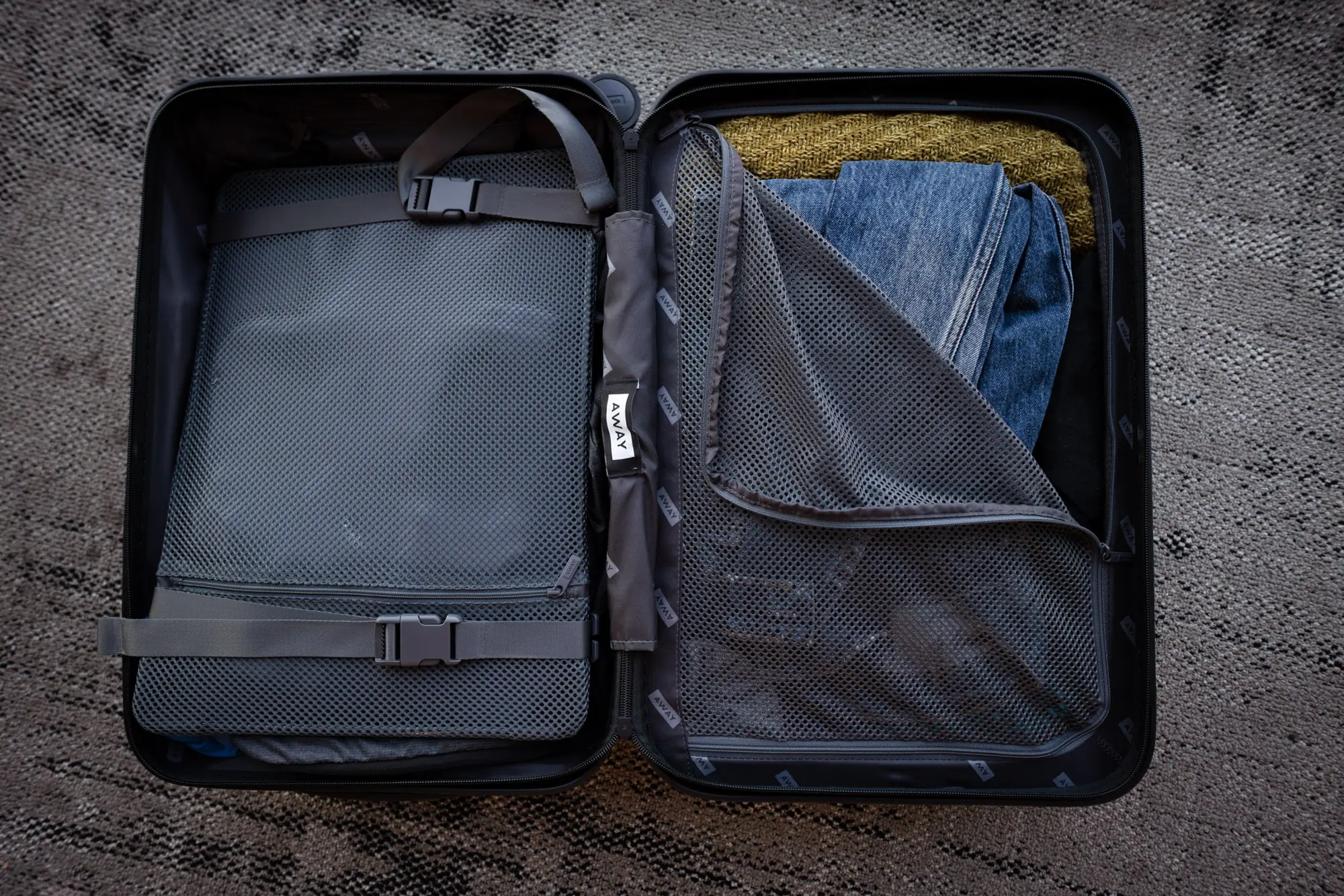 One side of this suitcase has a large, zippered compartment that keeps loose items in place. I love to slip packing cubes into this compartment. A panel with compression straps secures down the other side, making it ideal for tightening bulky items like sweaters and jackets. This panel also has a large mesh pocket, which is great for storing small items like electronics, loose cables, books, and other accessories.