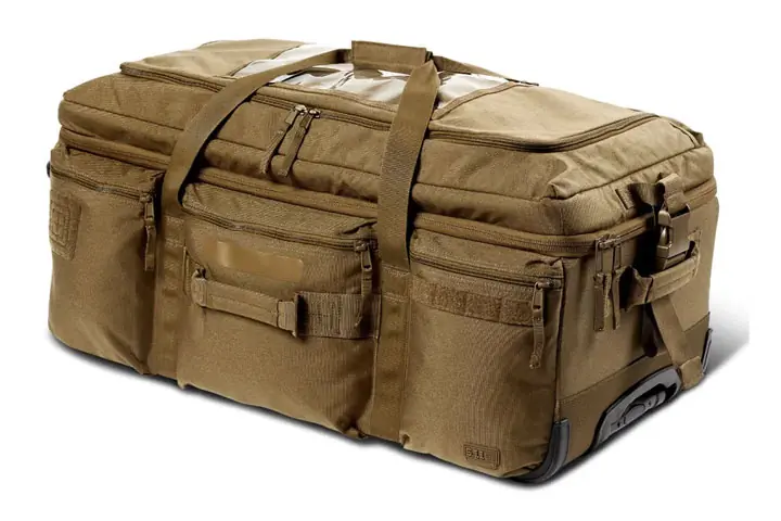 | 5.11 Tactical Mission Ready 3.0 90L | 28.75” x 16” x 13” | 14 lbs. | 90L | 1050D nylon, 1680D ballistic nylon | 150 lb. capacity, interior frame rails, rollaway top divider, Velcro patch attachments |