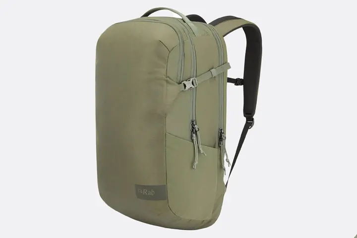 | Rab Depot 28L Daypack | 21.5” x 12.5” x 9” | 2 lbs., 8 oz. | 28L, 22L, 18L | 50% recycled ballistic nylon | Top drop-in pocket, pleated front panel, exterior compression, water-resistant laptop pocket |