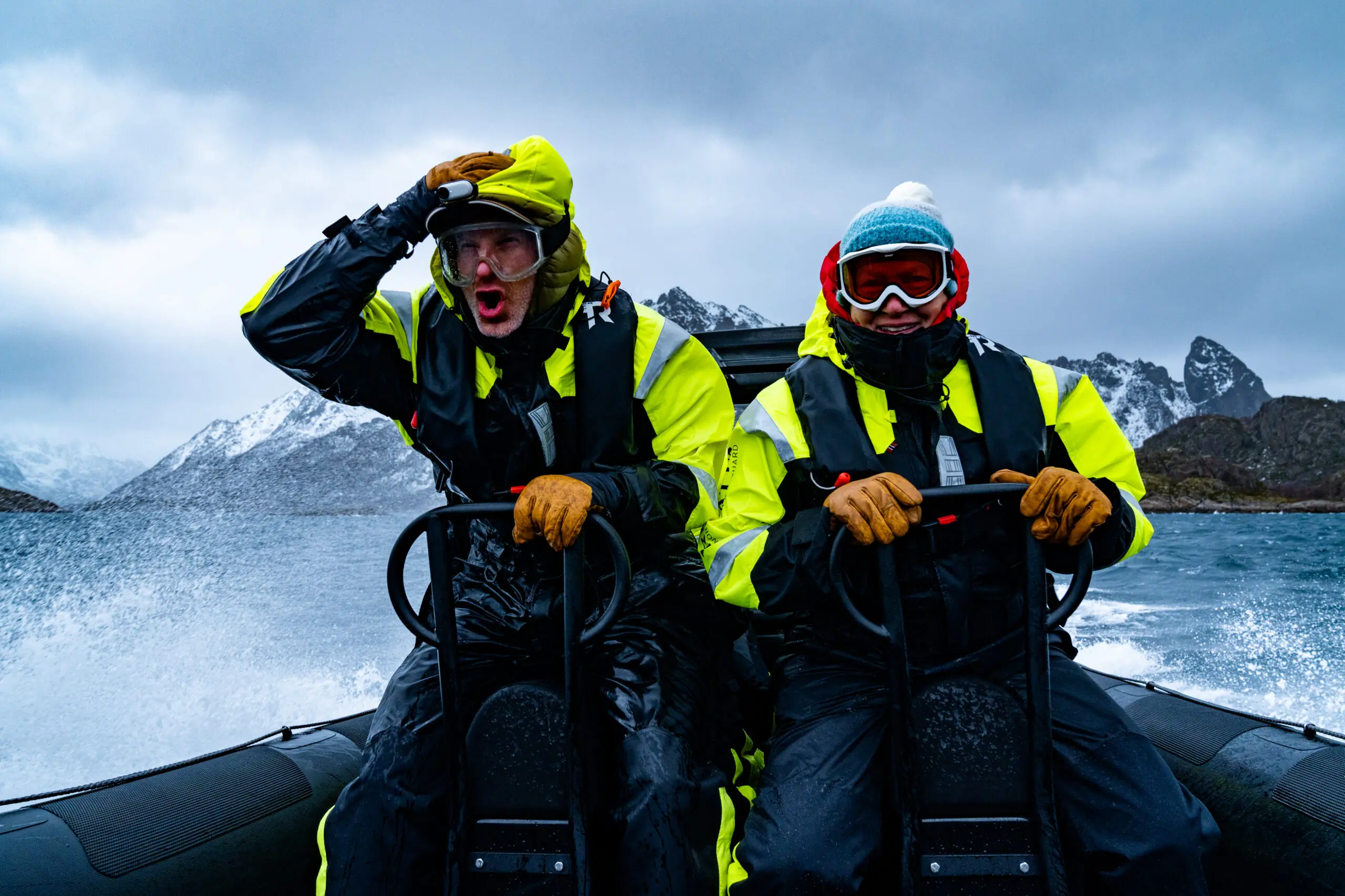 Our first adventure was sea eagle sightseeing. We zipped into oversized coveralls with built-in buoyancy, donned inflatable buoyancy vests, and boarded a RIB (Rigid Inflatable Boat). Complete with goggles to keep the sting out of our eyes from the wind and salty sea spray, we zoomed out of the bay and away from the town of Svolvær, the largest on the archipelago.