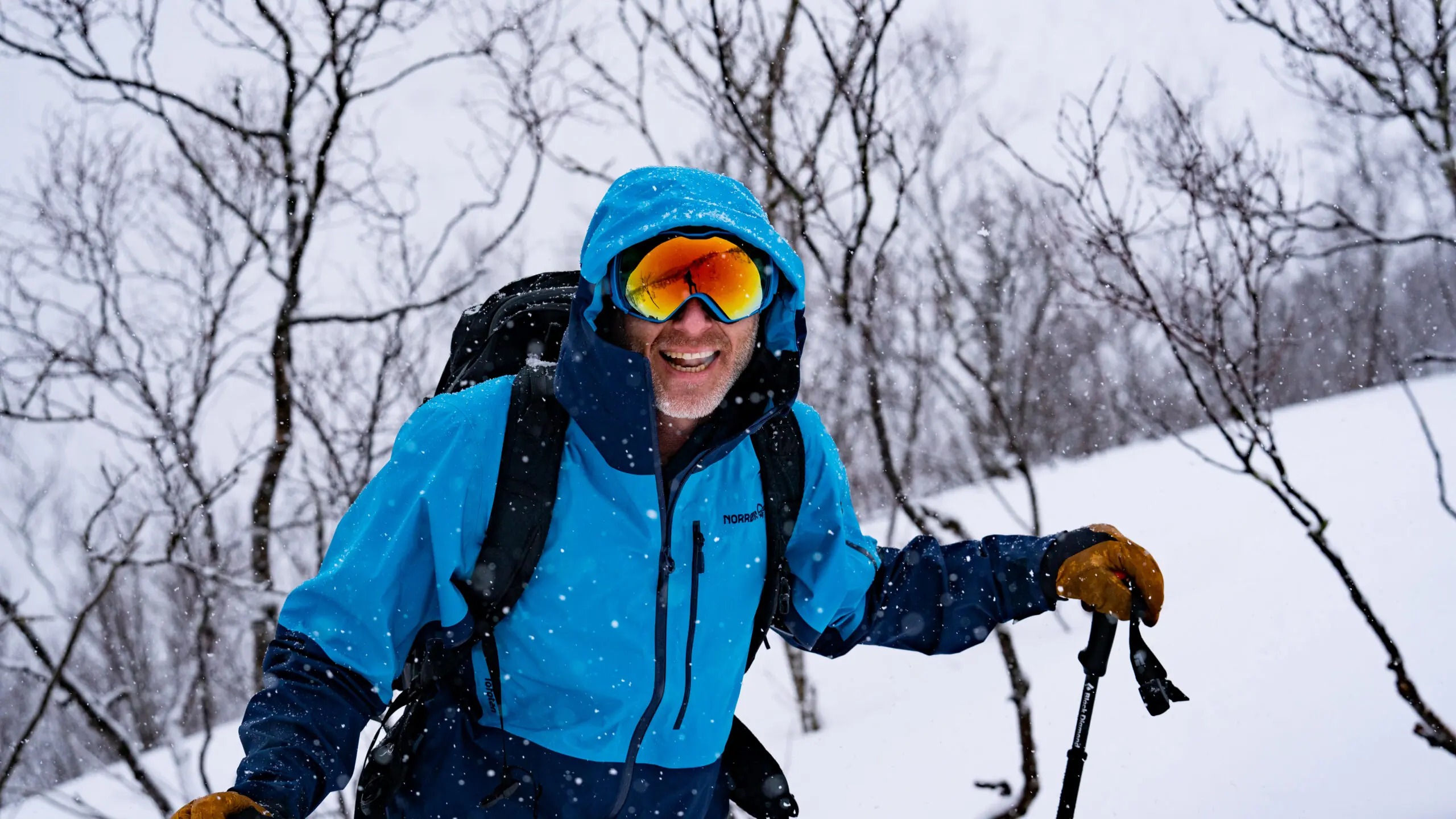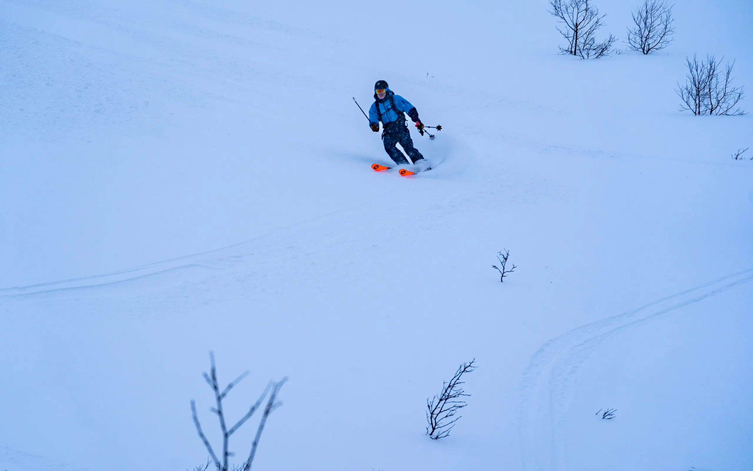 While I was skiing down, Östnes Fjord came and went from my view as the clouds and thick falling snow blew around me. Even though the wind tried to control my course, the water-resistant YKK zippers, powder skirt, and locked-down cuffs (along with the matching Lofoten GORE-TEX gloves, of course), kept the swirling elements at bay while I stayed warm and dry on the inside.