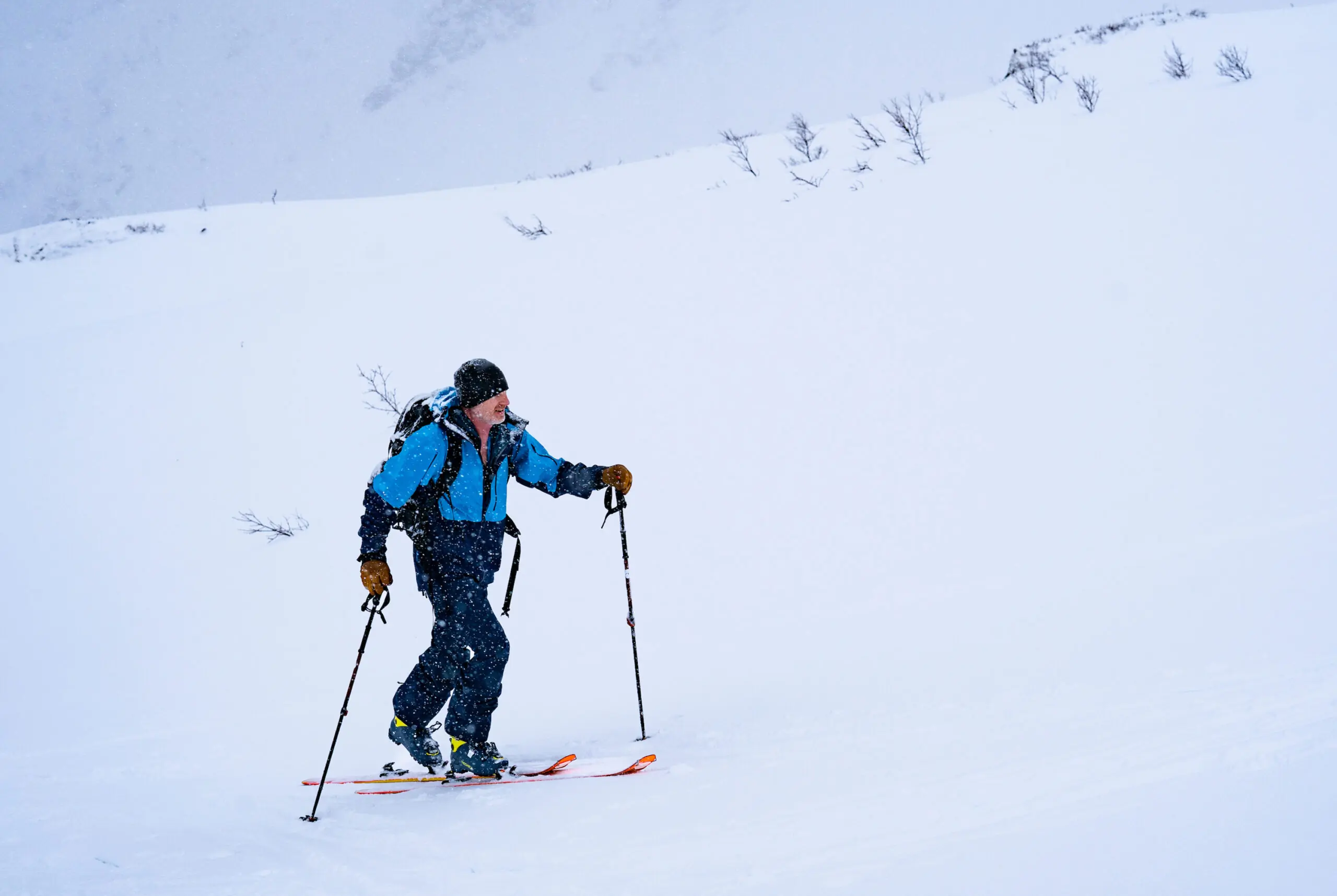While the wind was gusting the falling snow into my back, I had the front of my jacket partially unzipped and the pit zips open. I was at a very comfortable temperature while ascending the skin track broken before me. This was on the slopes above the Östnes Fjord in Lofoten — the most prominent archipelago reaching out into the Northern Atlantic Ocean along the western Norwegian coast.