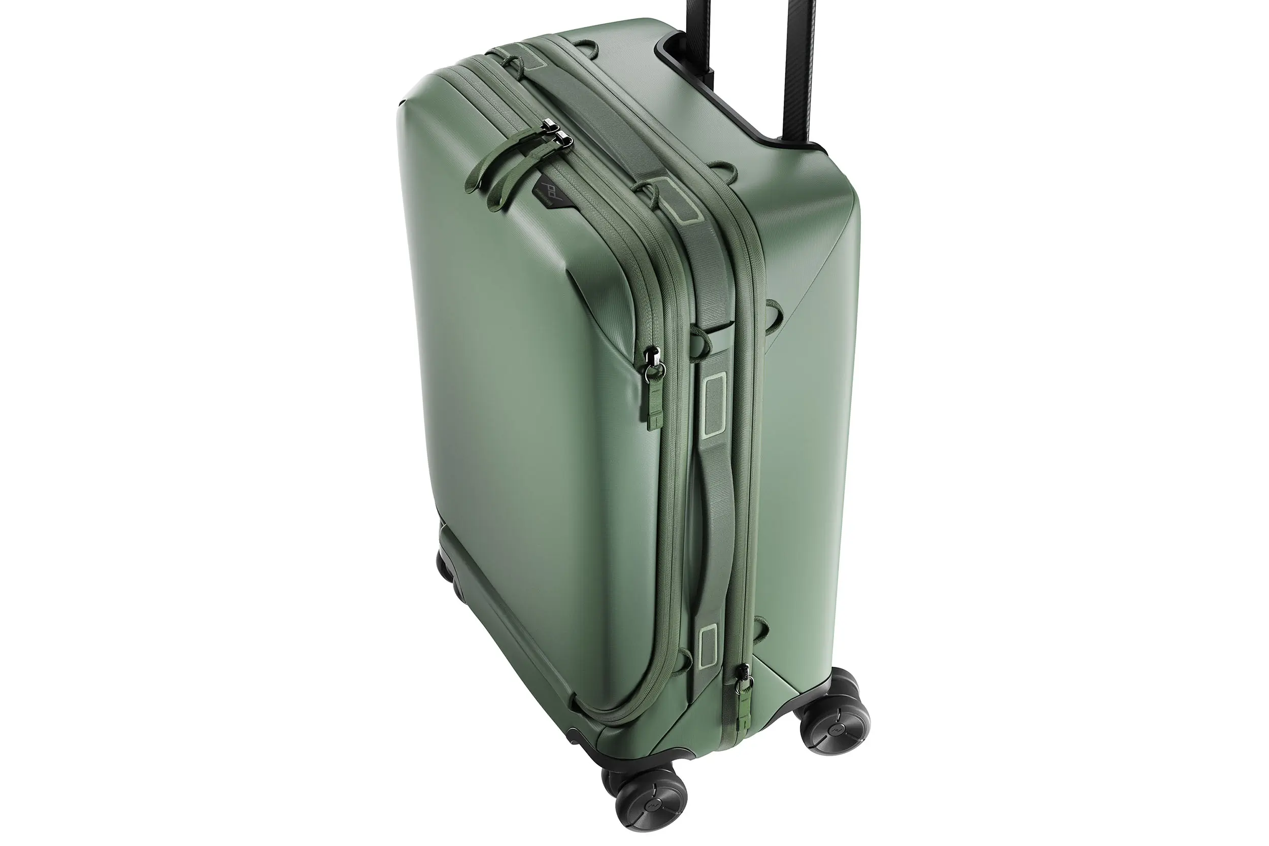 Starting with the handle, Peak Design’s “SlimDrive” is a patented, low-profile carbon fiber handle engineered for strength in a minimal volume. Standard roller handles are made from off-the-shelf telescoping aluminum tubes, which create large ridges at the bottom of traditional roller bags and create wasted space around them.