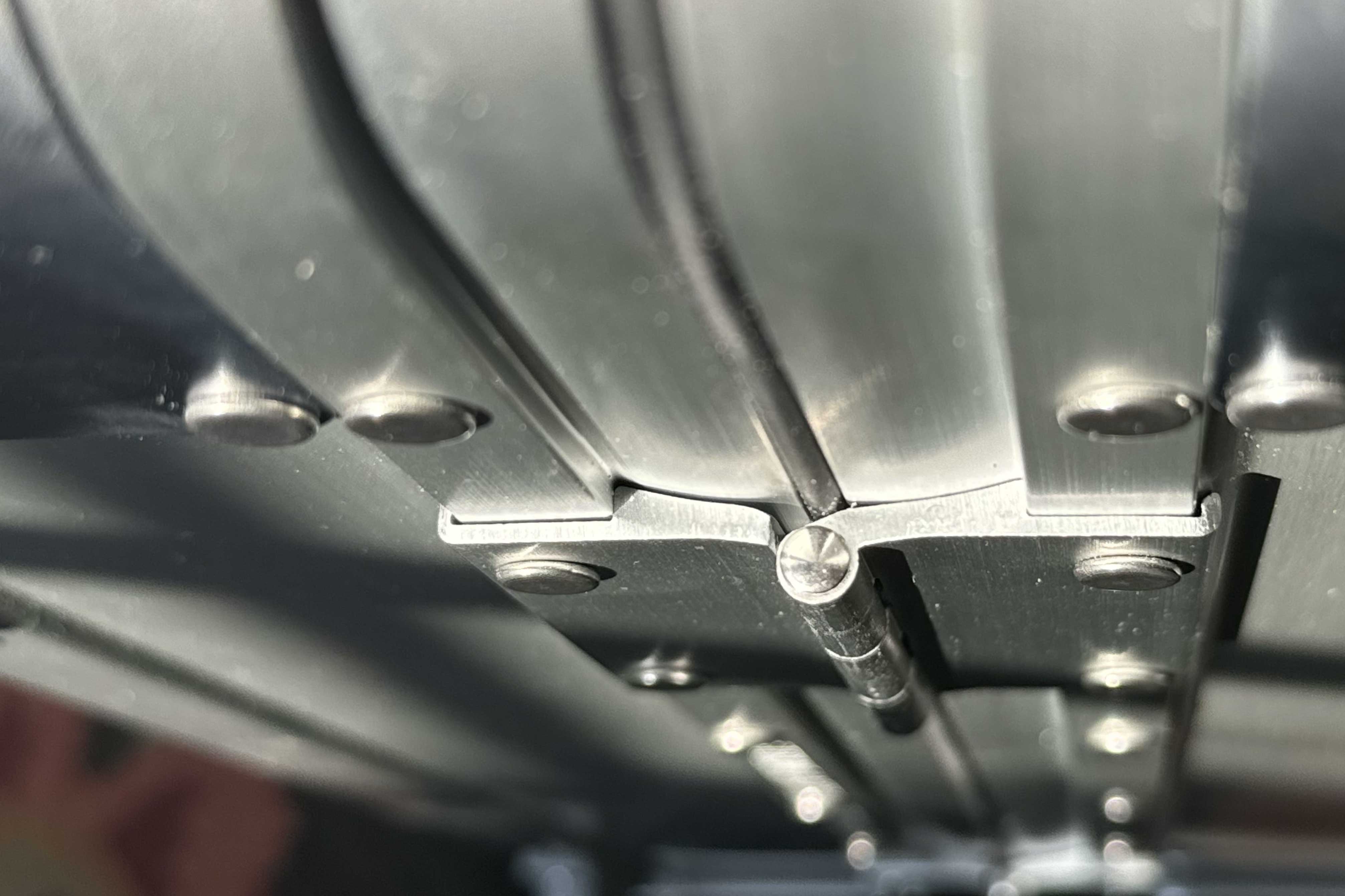All attaching latches, the handle, and hinge housing are milled to mount flush against the corrugated body panels. The thru-axel wheels nestle inside diecast A380, which is often polycarbonate (plastic) on comparable brands.