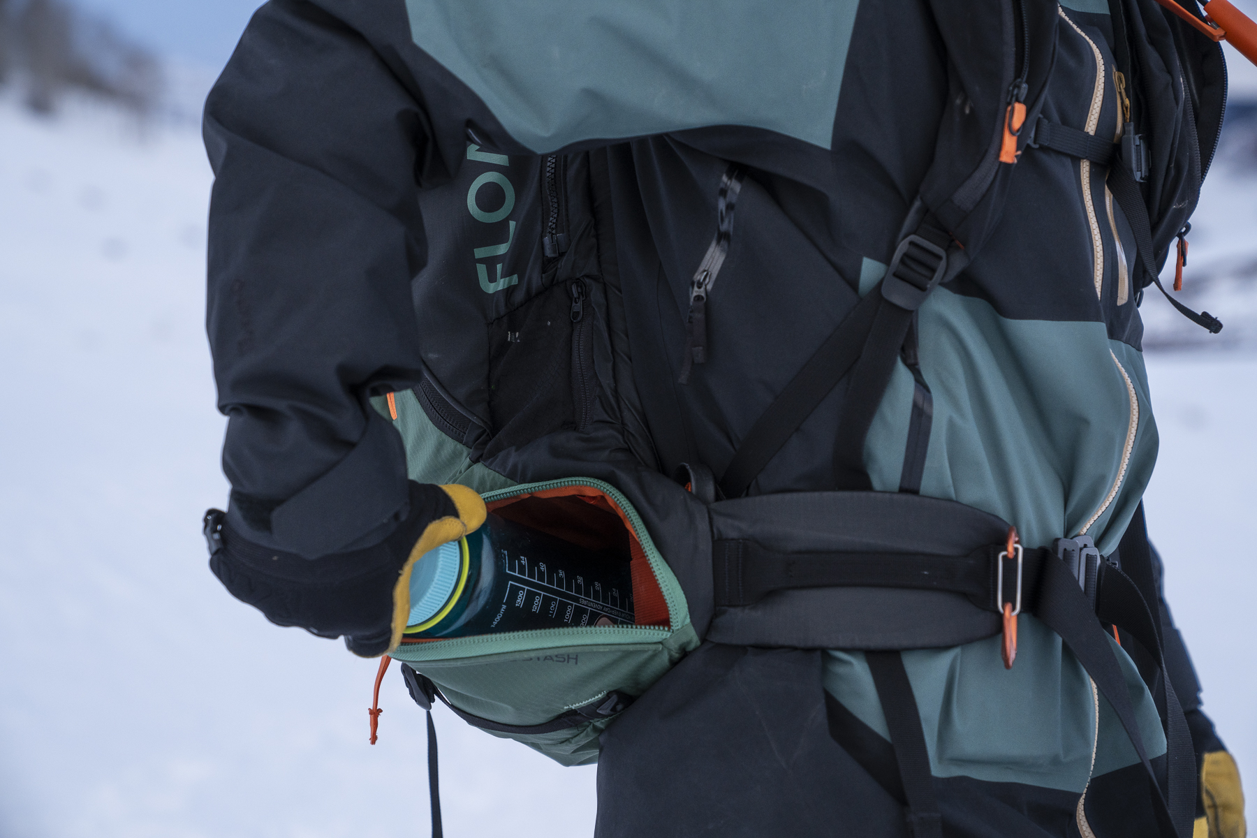 I found this side-entrance pocket design to be very handy for carrying things that I wanted easy access to while touring. That includes skins, water bottles, snacks, and a mirrorless camera. Being able to access these items without taking this ski pack off was a game-changer. This stash pocket also comes with an internal divider. The divider helps keep wet gear like skins or water bottles from spreading to the entire pack.