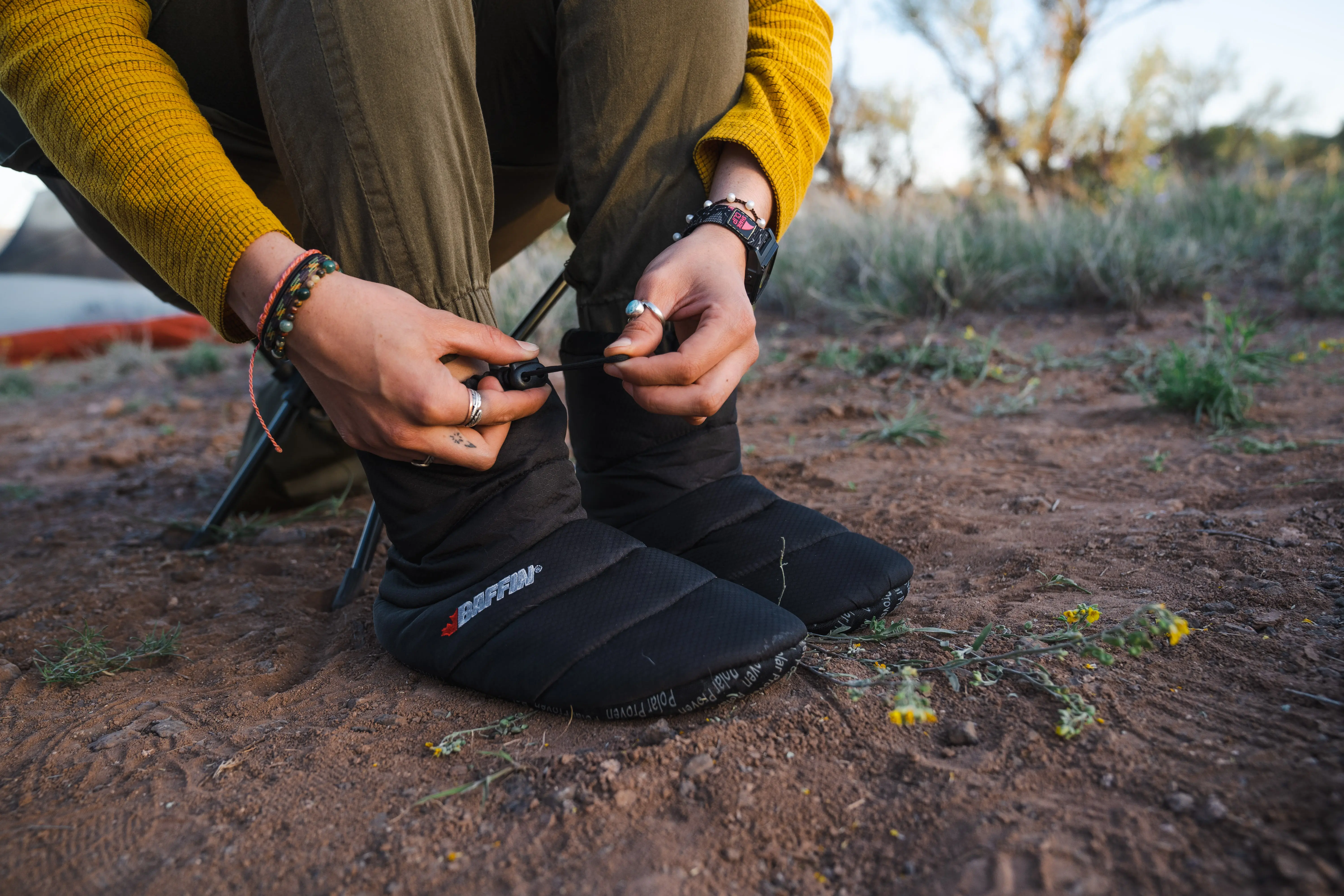 Waterproof booties are made with materials and coatings that prevent any water or moisture from penetrating the fabric’s surface. Think materials like GORE-TEX or eVent that are treated with coatings that are hydrophobic and cause water to bead right off. While we don’t have any waterproof down booties specifically listed in this guide, we would recommend the GooseFeet Gear Down Socks combined with their Waterproof Over Booties if you’ll be in more wet environments while camping.