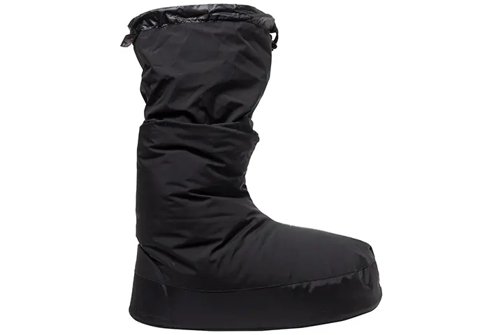 Some down booties are designed with an elastic cuff closure that fits snugly around the ankle or lower leg. The elasticity stretches and conforms to the wearer’s leg. Thus, it provides a secure closure without any added bulk from toggles or strings. Elastic cuffs are simple and can be comfortable if the fit is just right. However, if they are too loose or tight, you are limited in adjustability. Our choice for a down bootie with an elastic closure? The Montane Icarus Hut Boot Style Slippers.