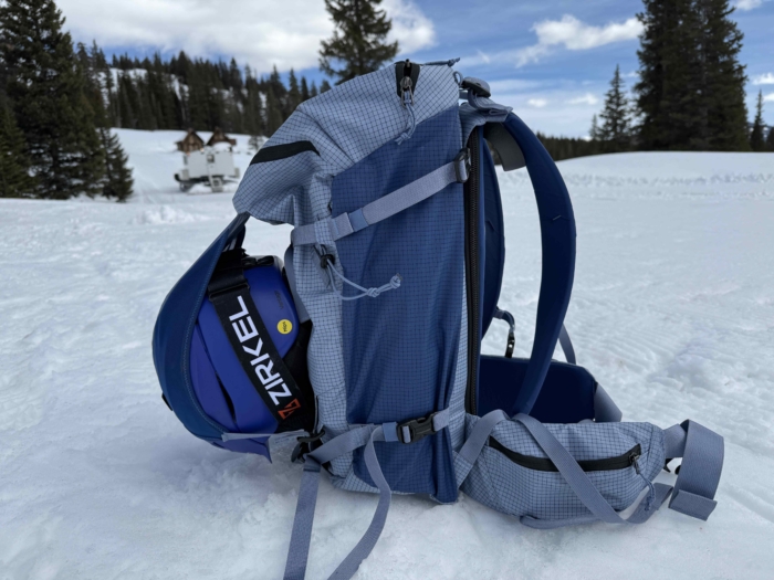 Withstanding weather, the pack’s exterior is PFC-free, while the exterior fabric and liner are made of recycled textile, which we appreciate. Overall, we like the bright touchpoints on the pack — the zipper and interior liners in the avalanche tool areas are neon orange — as well as the ability to carry all the safety gear we need or items for overnight hut trips.