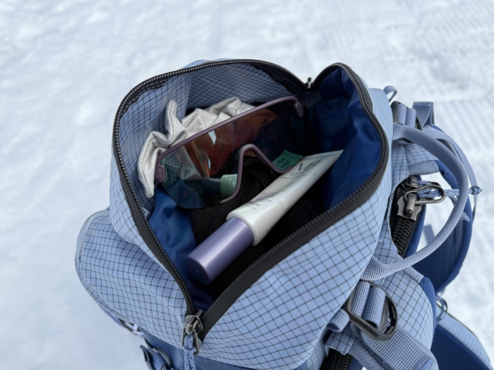 The adjacent layered storage is for stashing your beacon and shovel with two dedicated sleeves. Inside, the topmost portion of that alcove has a large mesh pocket — which we appreciate for holding snacks, skin wax, and our satellite communication device, but we wish that there was a zip closure to secure stowables in place. Especially when we lay the pack down to enter through the back panel, items tend to run loose from that mesh hammock.