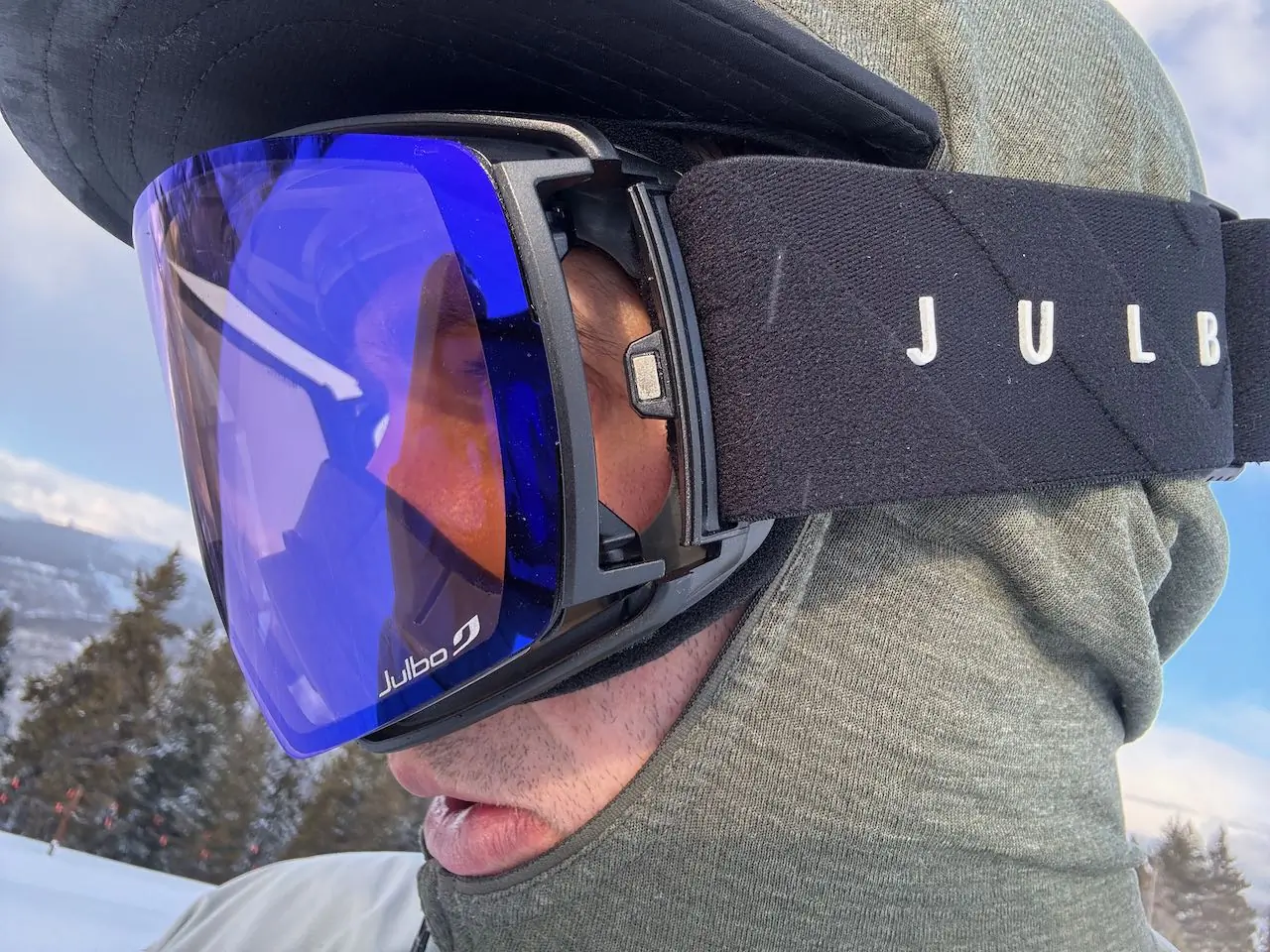 Generally, goggles are too enclosed to wear while working up a sweat on the skin track, which leads to fog buildup. Julbo has a unique technology called the Super Flow Pro that allows wearers to pop forward the lens, enabling airflow and warm vapor to escape. But in other instances, backcountry tourers use sunglasses and a hat on the ascent and then transition to a helmet and goggle for the descent.