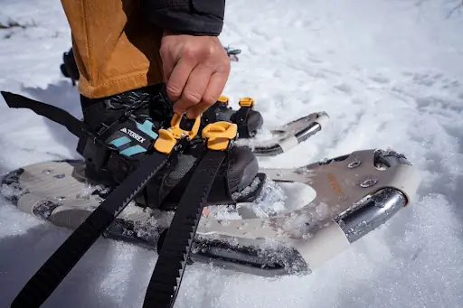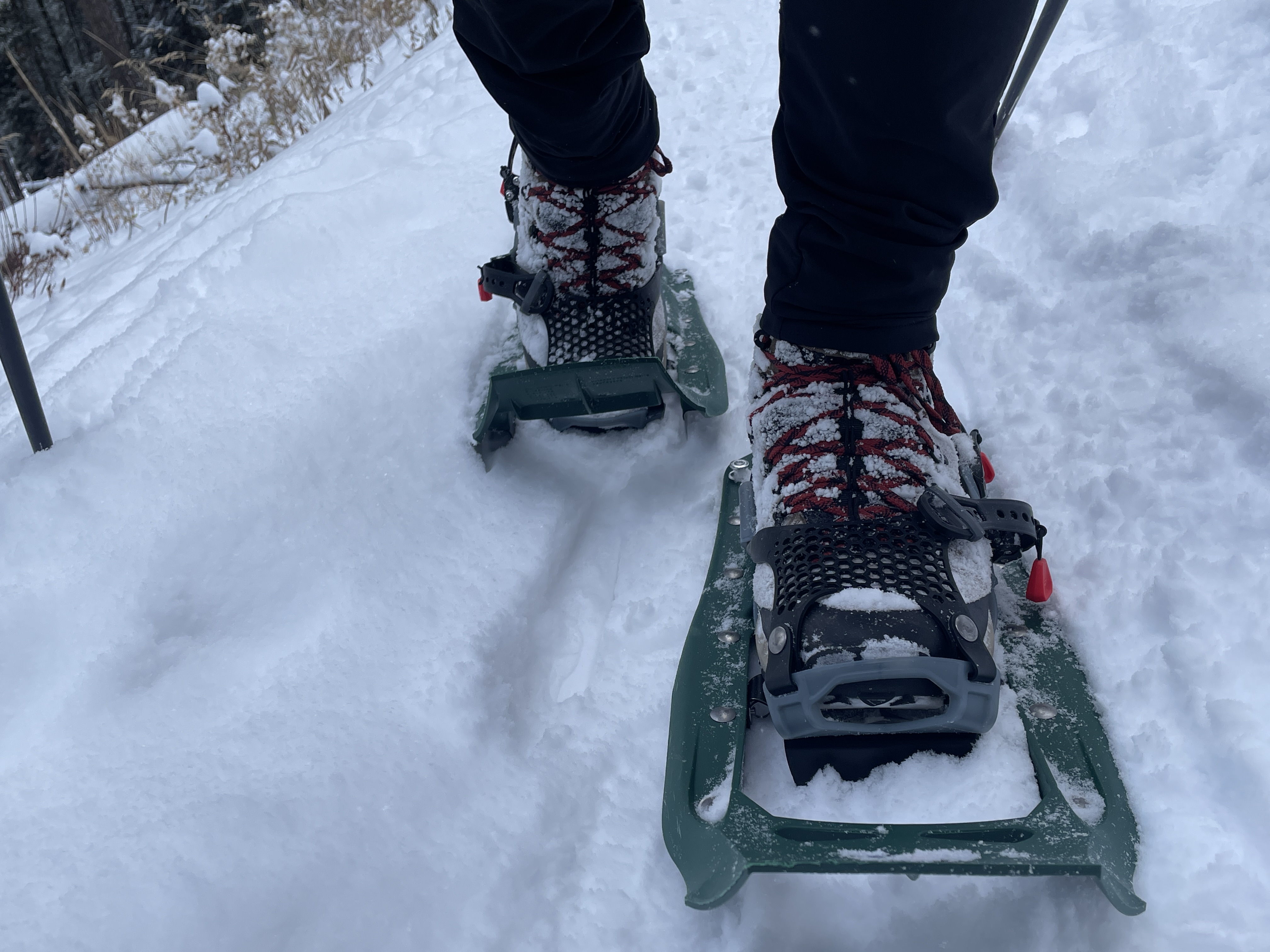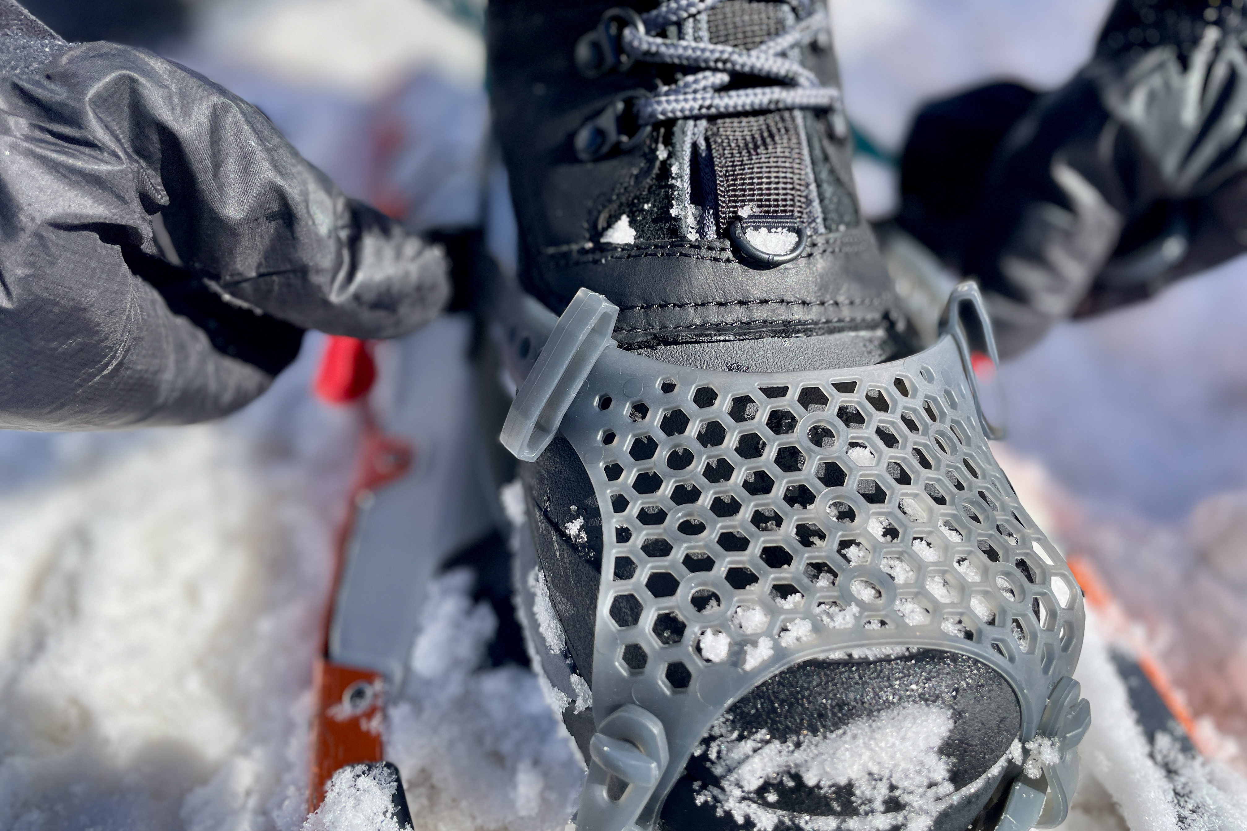 Figuring out how to best attach your snowshoes can sometimes be tricky, and it’s recommended to try it inside with warm hands first, as things quickly get harder to do in inches of snow with cold fingers, or while wearing mittens.