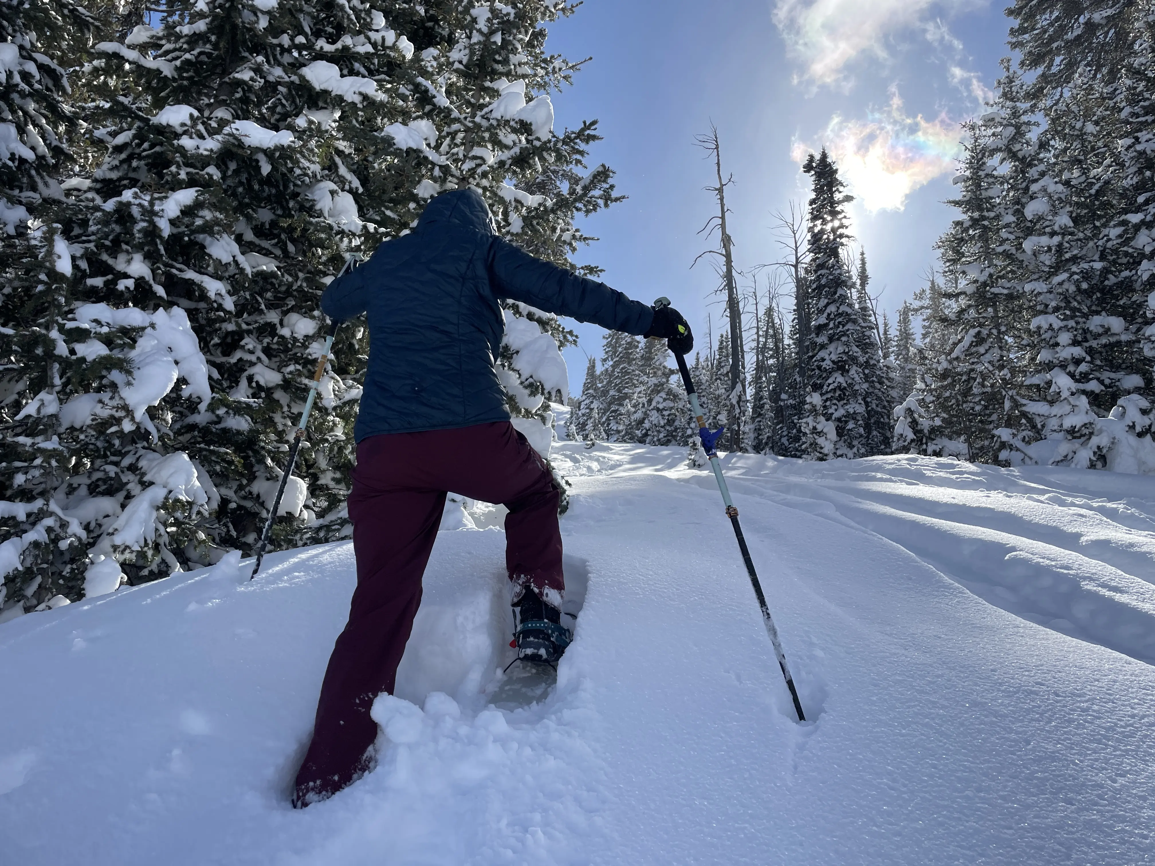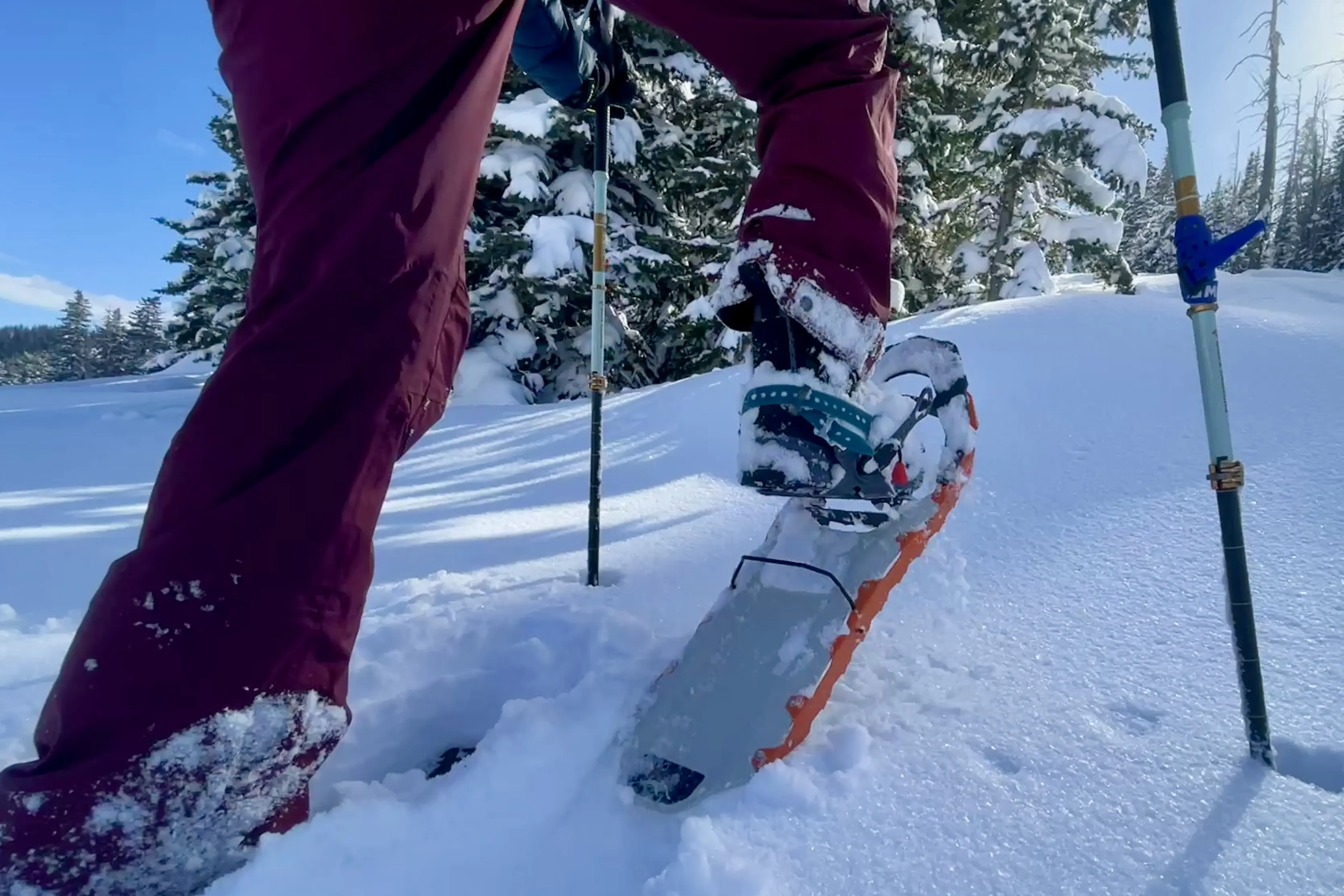 The MSR Lightning Ascent with the additional 6-inch tails will provide incredible flotation in deep snow. Remember, snow is just frozen water, and we still want to stay afloat. Look for snowshoes with high flotation ratings