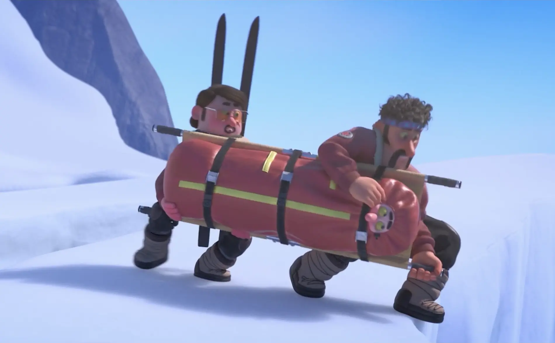 Hors Piste features SAR ski mountain rescue team, Salami and Parmesan. Yes, the names are fantastic. Moving on. The movie opens on an unnamed, jagged matterhorn rising above the clouds. Salami and Parmesan are tasked with rescuing a fallen skier, but the mission quickly takes a turn. There are some epically dangerous mountaineering moves executed on their descent. This film is essentially about how not to cross a glacier, how not evac an injured person on a litter, and how not to make it down the mountain in one piece. Or is it?