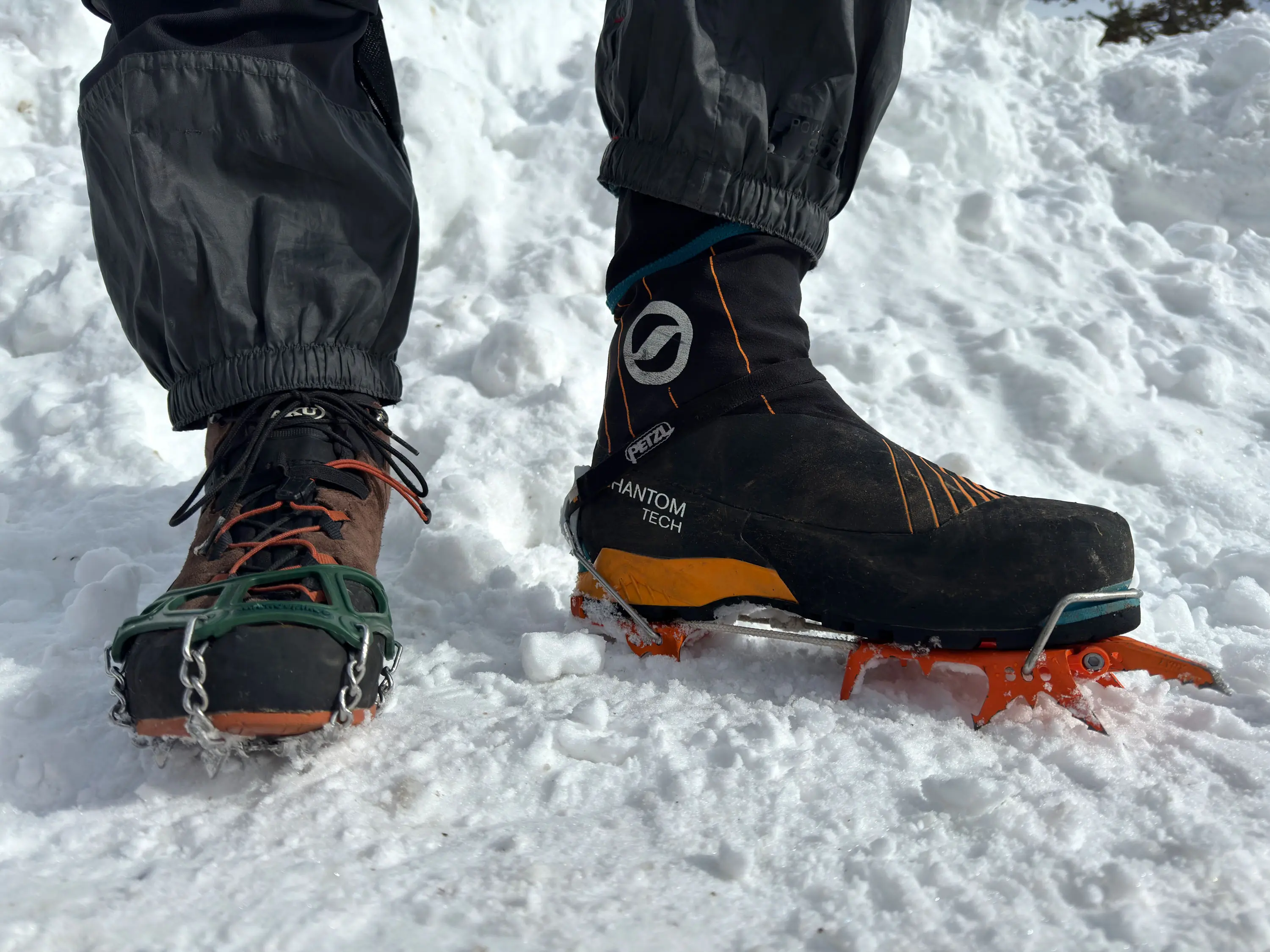 Crampons are a safer choice for technical, steep terrain. Compared to the “micro” spikes, the extreme bite and position of crampon spikes are better equipped to help navigate crevassed glaciers or vertical ice. Some microspikes, like the Hillsound Trail Crampon, are a nice middle ground for slightly steeper terrain, but still aren’t a crampon alternative for technical terrain.