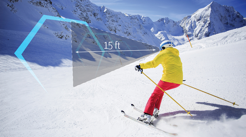 The interface displays a virtual 15 feet in front of the rider. This makes it easier to interact with the technology while still being aware of the slope.