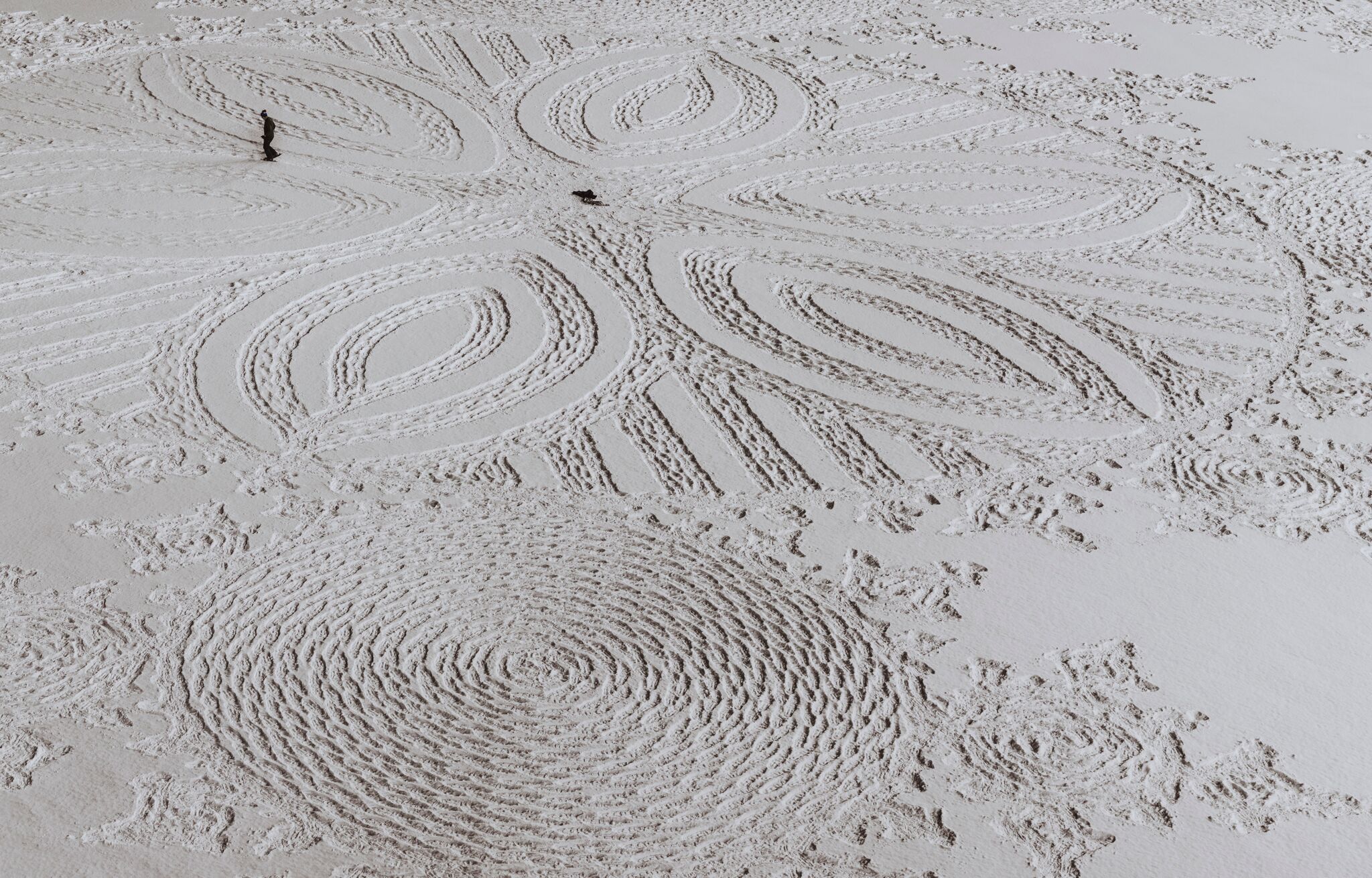 Born in London in 1959, Beck has perfected an unlikely craft: snowshoe art. By traipsing through a carefully planned route, Beck creates massive and ornate designs through the snow.