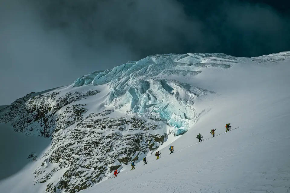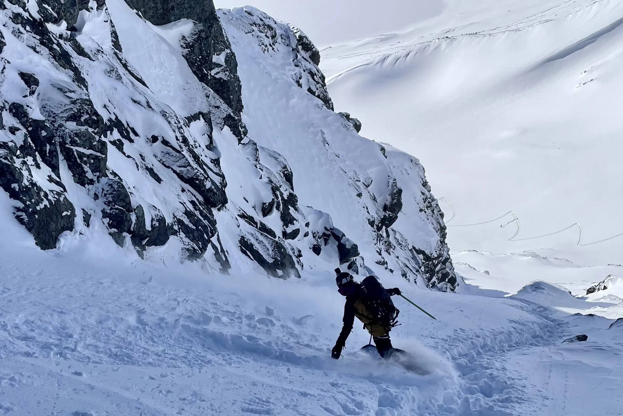 Zephyr didn’t let up that first morning, but graybird skies turned blue, and I got my first real glimpse of the Tarfala Valley and the Kebnekaise Massif. Beautiful is a woefully inadequate descriptor. The range was a freerider’s dream playground. There were rocky peaks with couloirs slicing down their flanks, mellow, glacial pitches and spicy faces everywhere I looked.