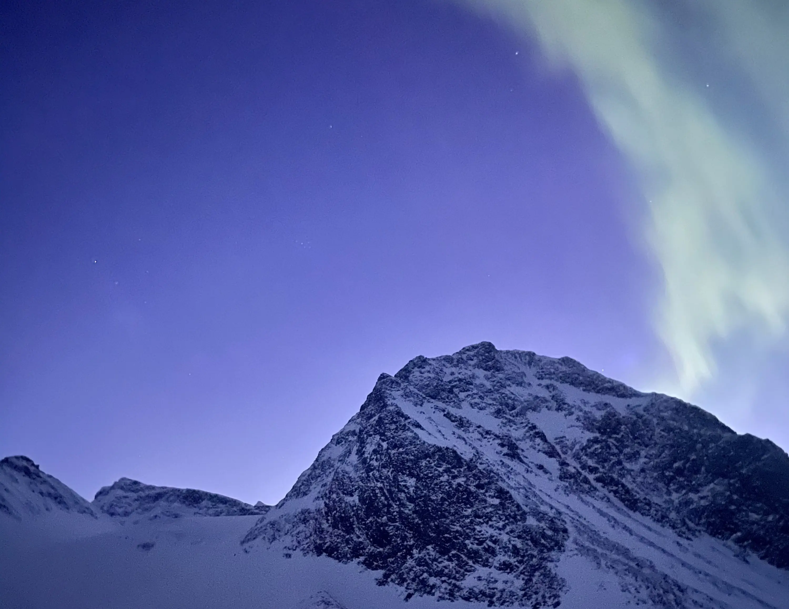 The evening skies darkened over Sweden’s Kebnekaise Massif, so I pulled out my phone to capture the moment, with my guide Matti Saapunki, skinning through the foreground. I managed to snap a photo, but my fingers instantly froze up.