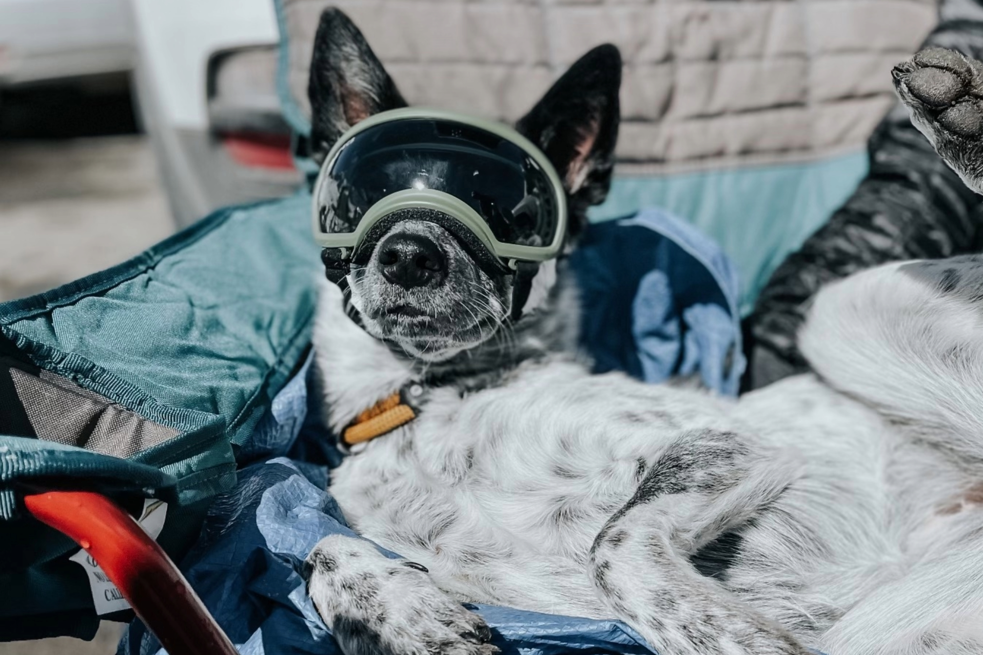 Rex Specs doggles (goggles for dogs) can be handy as well when traveling in the alpine. Dogs (especially those with lighter-colored eyes) can get sunburned or irritated eyes from too much exposure. When we’re going above treeline, hanging out somewhere with lots of sun exposure, or if it gets really windy, we use Rex Specs doggles to protect our dog’s eyes. She looks rad in them, too.