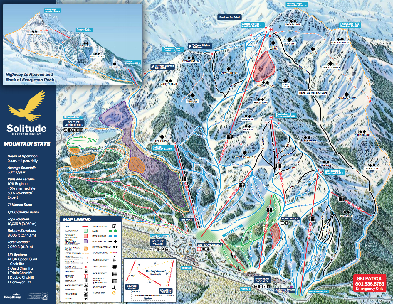 Solitude Mountain Resort is located 34 miles from Salt Lake City in Big Cottonwood Canyon. The 1,200-acre mountain contains 77 runs and three bowls, with 2,030 feet total vertical drop. Solitude’s off-piste terrain is also a popular draw.