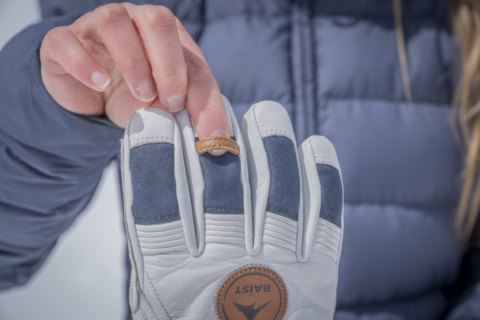 Two locations on each glove offer a loop for hanging the gloves with a carabiner. There’s a durable leather loop on the middle finger. There’s also a leather tab with a reinforced metal loop at each wrist.
