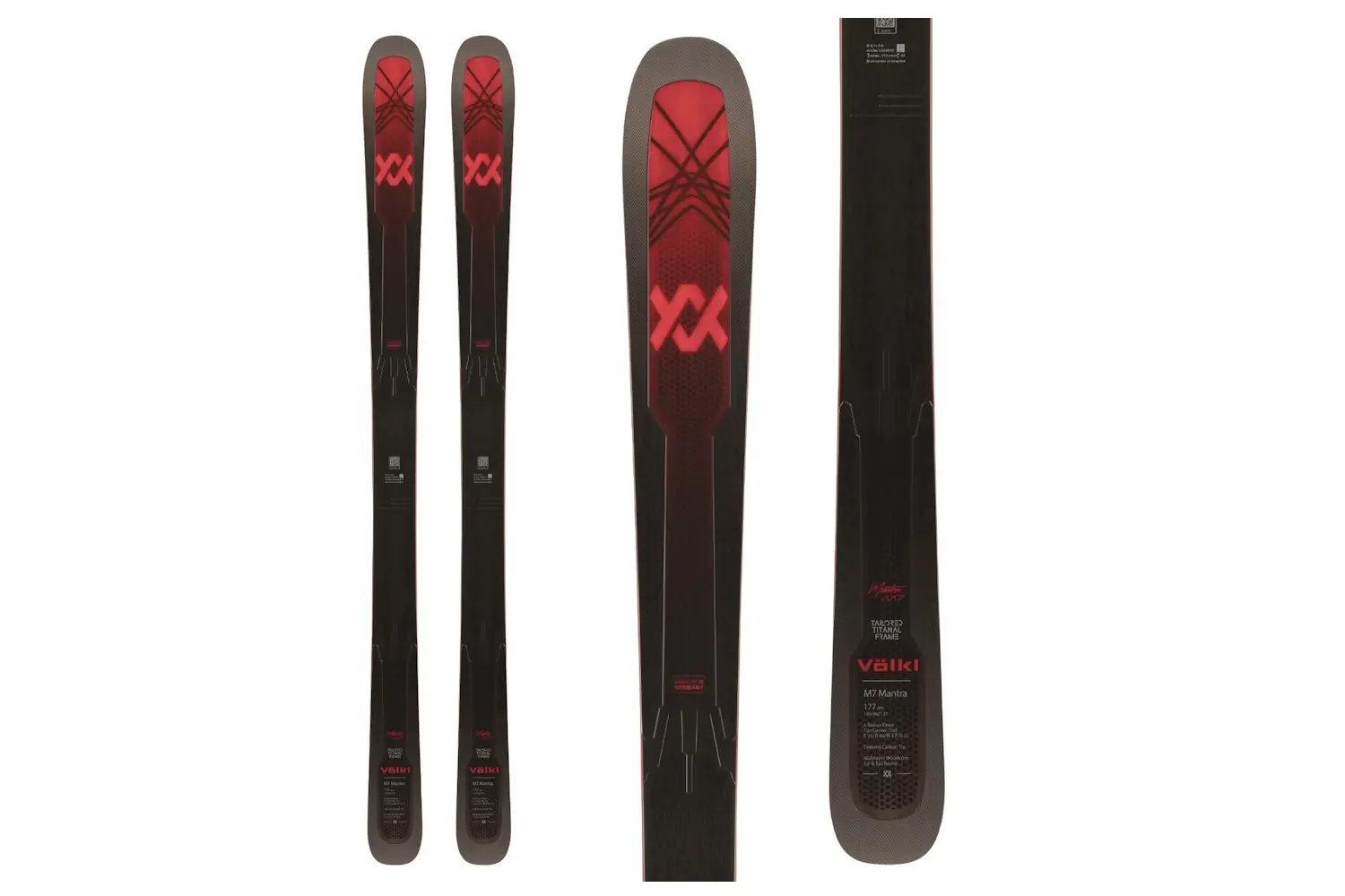 The Volkl M7 Mantra ($850) starts to creep into the premium zone with upgrades that include the 4 Radius Drive design, an advanced development of the 3D Radius Sidecut. The intent is to maximize versatility for variable snow on groomers and off-piste, increase stability on solid surfaces, and improve performance on soft snow.