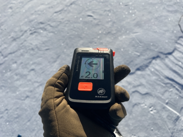 As we get within 10 m or so, we want to take off our skis/splitboards/snowshoes. This allows all rescuers to move a bit more freely in the area. As the distance gets to 5 m or so, we want to get the beacon right around knee-high, right above the snow surface. This part is where you have to really slow down and allow the beacon to process the signal.