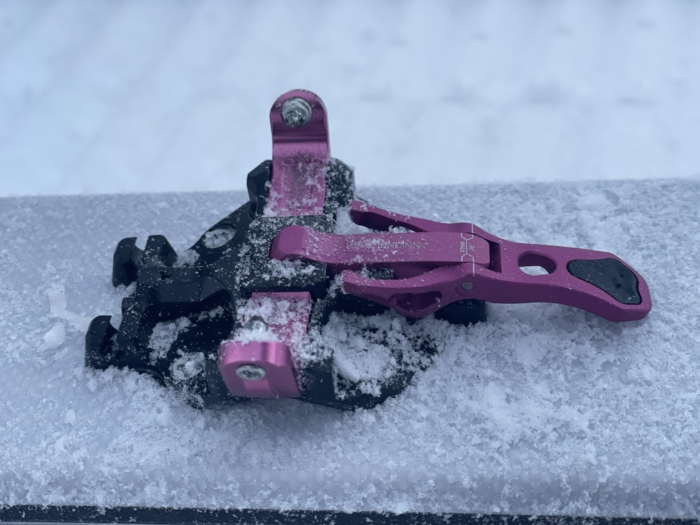 The Tech: The standout feature is the sturdy heel tower, which rotates while keeping the risers facing forward. The all-aluminum frame is bombproof yet light, and the 40mm mounting pattern adds stability on wider skis. Instead of a standard DIN screw, it uses three interchangeable “U-springs” (labeled Women, Men, and Expert) to set release values. It comes with a leash, but we personally installed the optional alpine-style brakes.