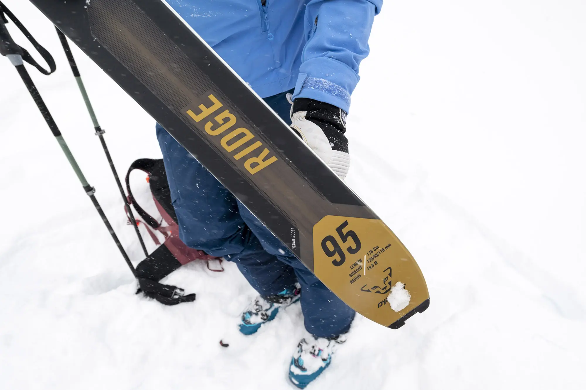 Most skis are built with a wood core, usually beech, poplar, or aspen. Add metal to the construction, like in the Dynafit Ridge 95, and the ski gains stiffness and stability at speed. But, it also gets notably heavier. Many ski manufacturers strategically integrate carbon around ski cores for metal-like performance enhancements without the weight. For instance, the Black Diamond Helio Carbon 88, LaSportiva Tempo and Blizzard Zero G 96.