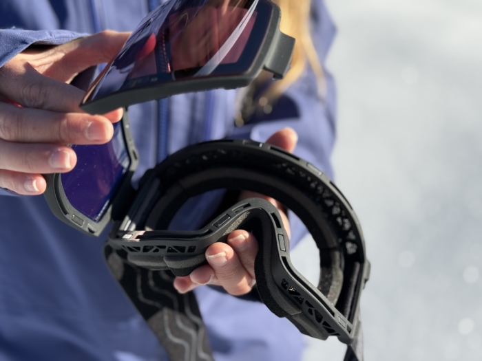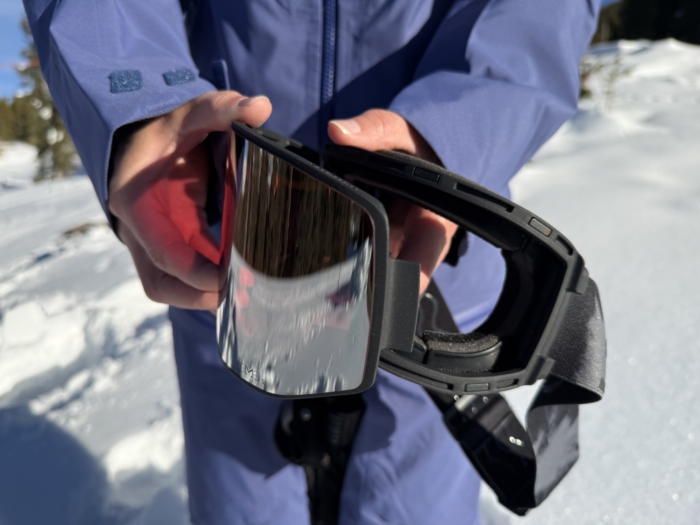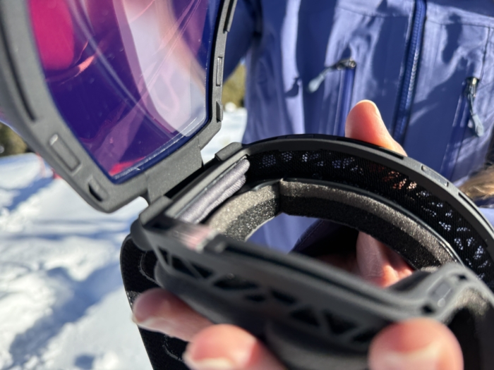 Traditional interchangeable lenses have a handful of tiny teeth around the edge that pop into and out of divots in the plastic frame. You need to align the divots, which can be a tad time-consuming if you’re not familiar with the process, so be sure to practice at home before going on the ski lift to swap out a lens. You can also get fingerprints on the lens, so carry a goggle wipe to clean up.