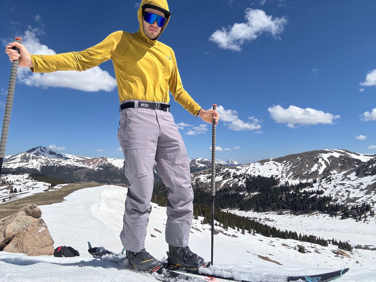 Slim-cut pants are common for backcountry skiing and touring because there’s less material to get snagged on crampons, ski edges, or boots. Adding a hardshell, puffy belay pants, or a harness for glacier travel over slim-cut touring pants is easier than adding a baggier pair.