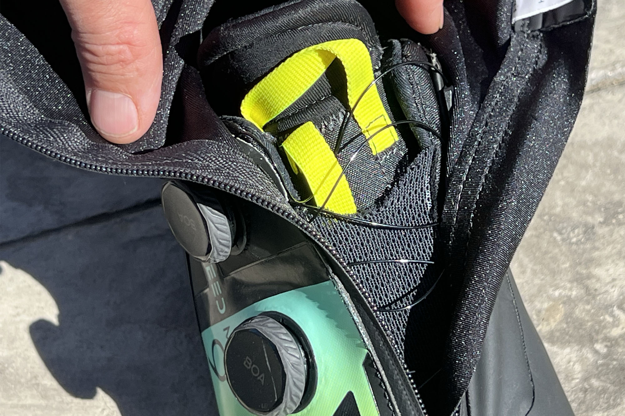 Click, click — the two external BOA dials popped as I pulled them to release tension on the inner bootie. I grabbed a yellow tongue strap and heel strap and pulled my foot in.