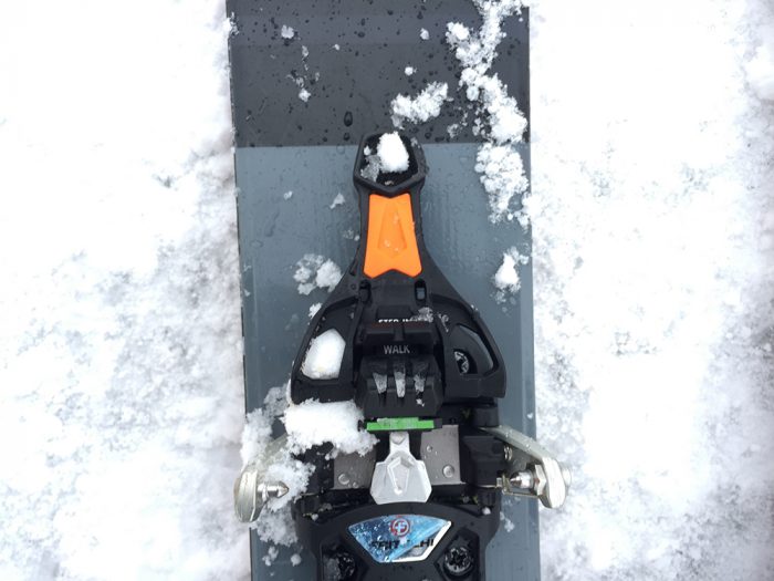 If you’re flexible enough, you don’t have to get out of the binding when transitioning to ski mode. But I like to walk around when I summit…or sit down, eat a snack, and look at the pretty mountains. Either way, push the heel piece of the Tecton down until the brake deploys (you’ll hear a loud “thunk”) and drop boot heel into it like an alpine binding. You’re ready to ski.
