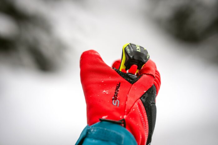 Skiers can click in by sliding the glove’s loop onto the attachment point (making sure they hear or feel an actual click before skiing off). Then they click out by pressing down on the release button and sliding their hand slightly up. Easy.