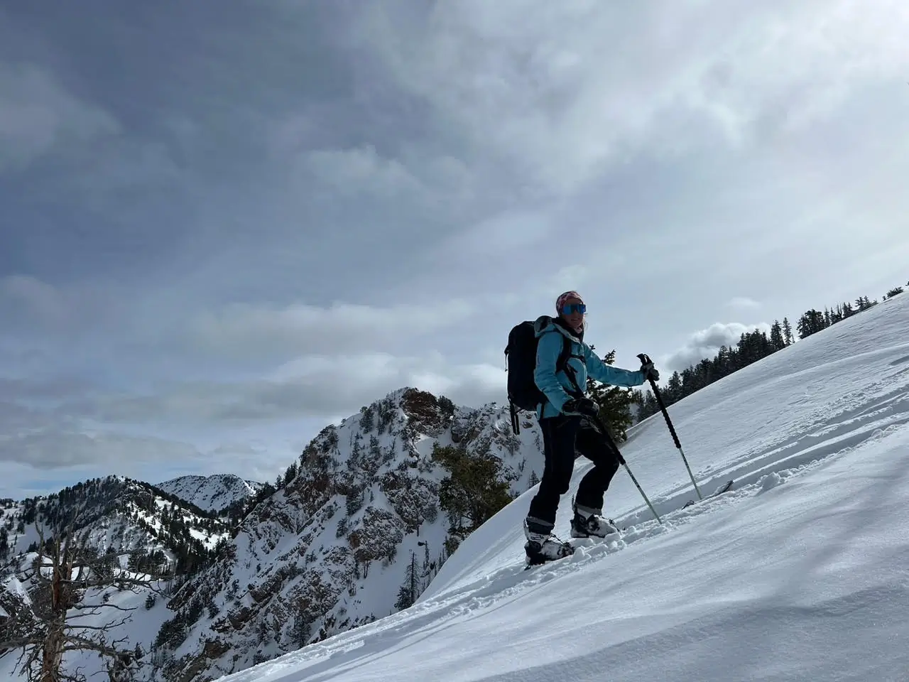 Layers of white-capped peaks poke into a bluebird sky. I break out of the woods onto an open slope in Utah’s Central Wasatch. It’s steep. And I feel my hips shift as I traverse across, my uphill ski sitting higher than my downhill ski. I shift my body weight around to keep my balance.
