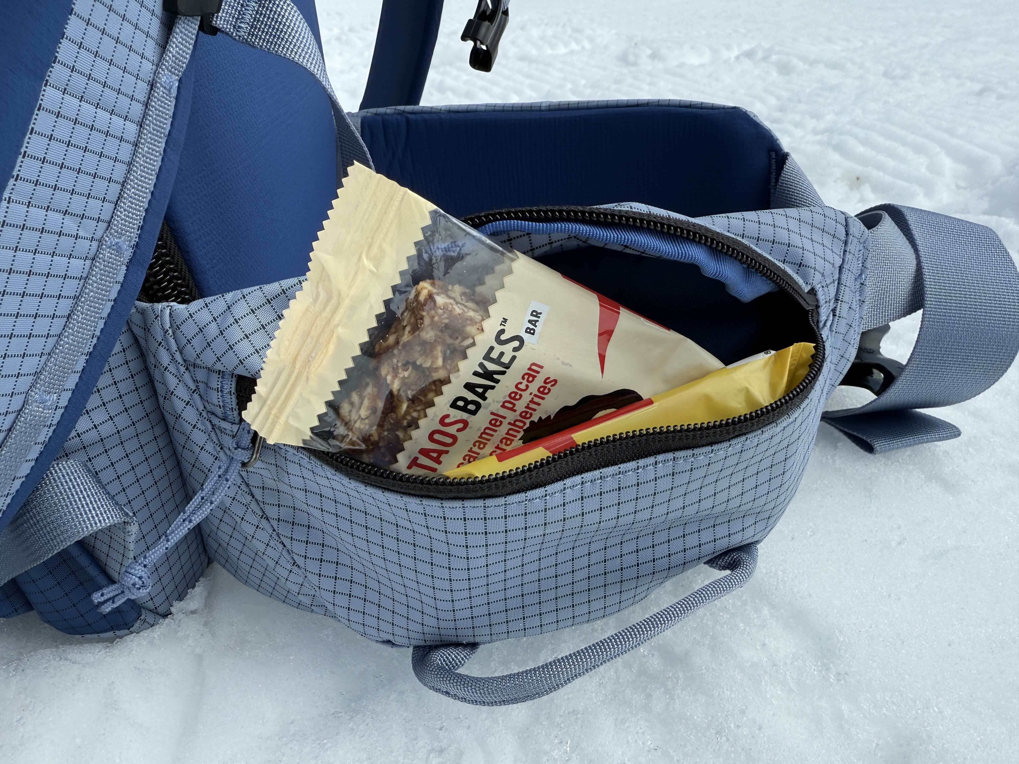 I appreciate it when a ski pack has two sizable hip belt pockets. I prefer versatility and ease of use over minuscule weight savings. While these two pouches aren’t spacious enough for a large phone, they can fit a pile of snacks, cosmetics, and smaller tools.