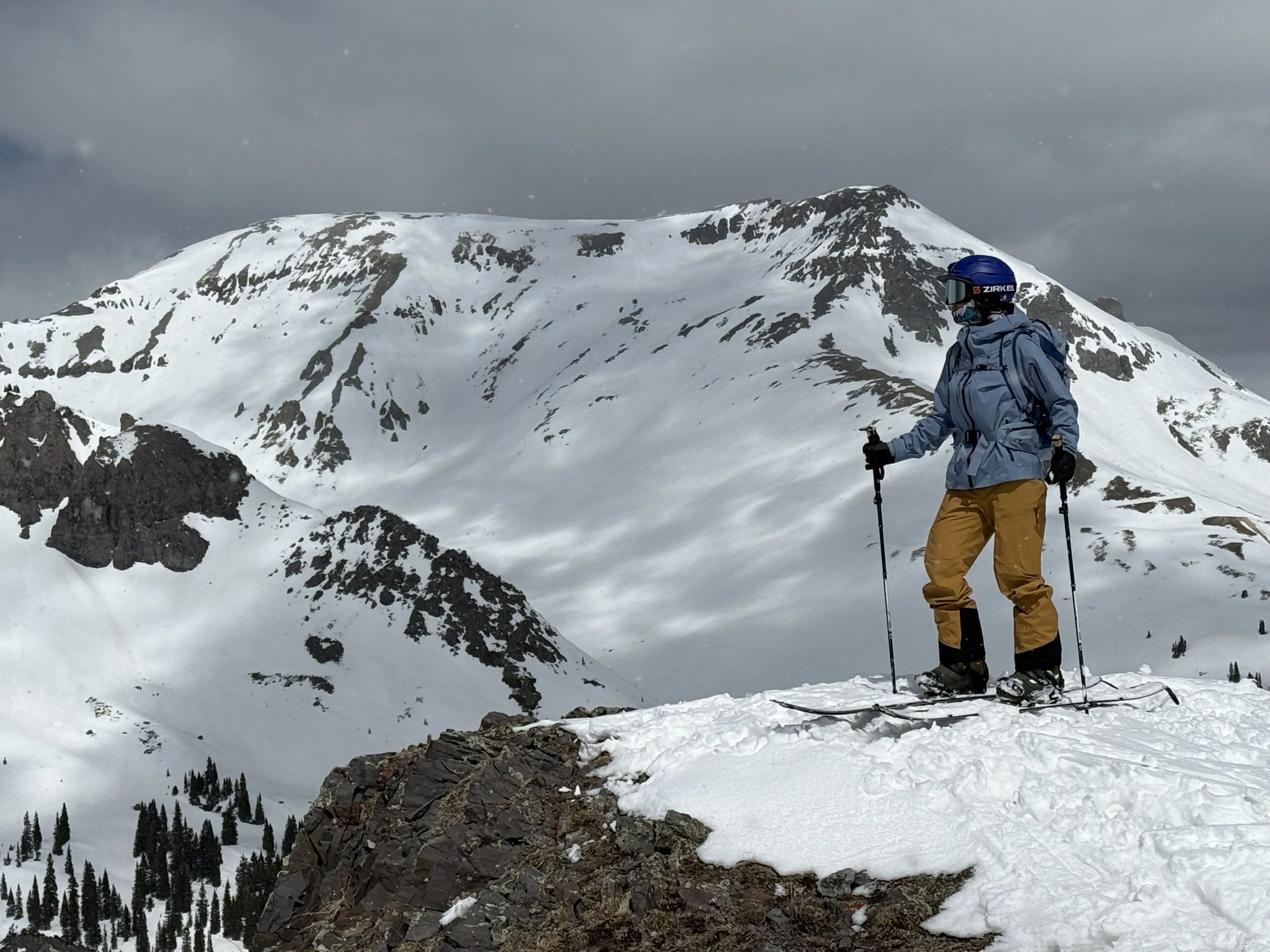 While transitioning at 12,100 feet, I watched the storm clouds start to break. I quickly unzipped the cargo pocket and pulled out my large phone. Tinkering with the camera, I stuffed my ski glove in the pocket and snapped photos of the views. The air was frigid, and my hands quickly got cold. So I quickly pulled the ski glove out and on and dropped the phone into the bellowed pocket.