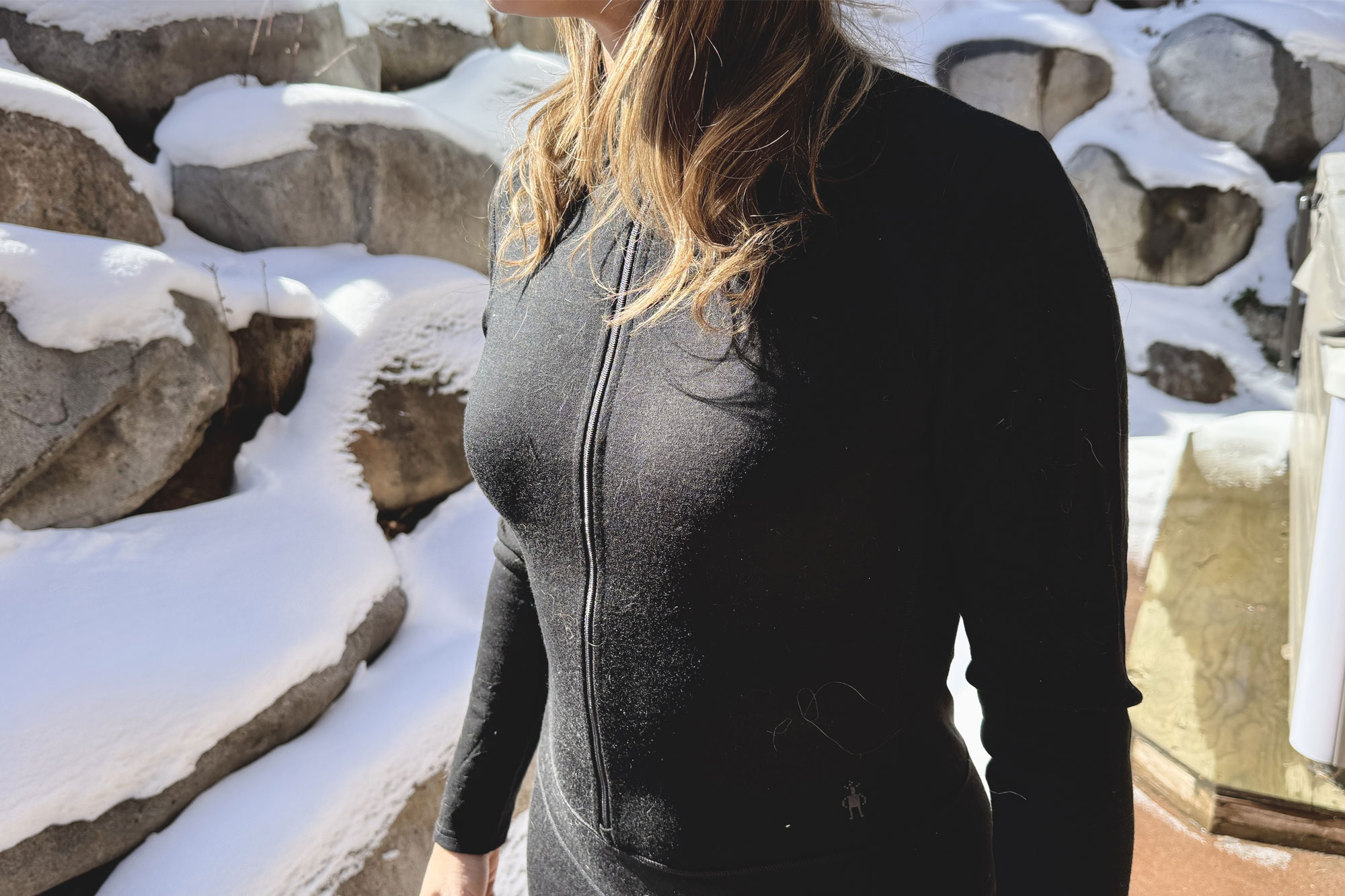 Of course, merino wool’s natural temperature regulation helped, too. The fabric wicked sweat well during sustained skiing, and it never felt clammy during lift rides. And, odor resistance was excellent, even after multiple wears. (Because no, I didn’t wash it for all four of my testing days.)