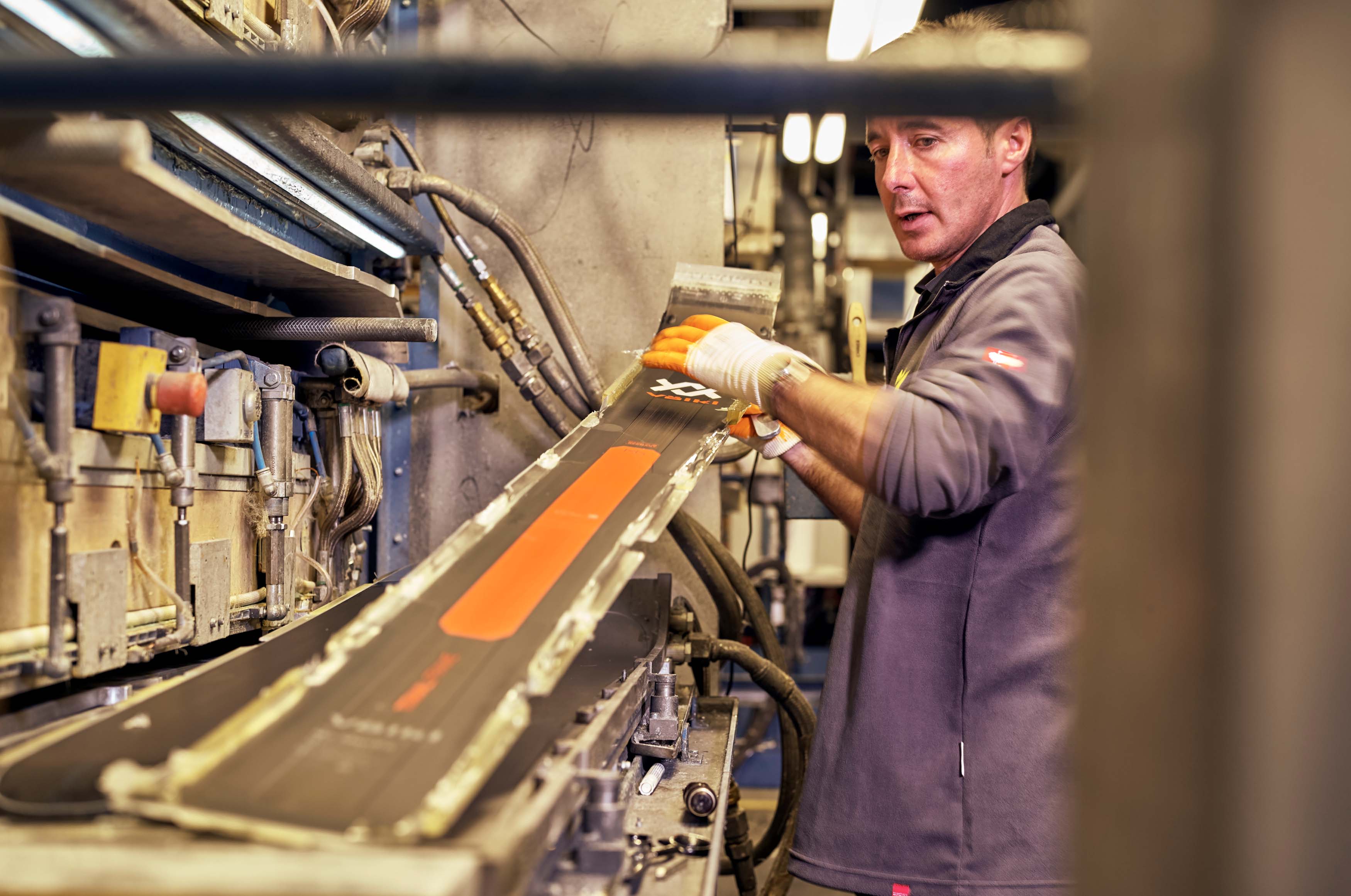 After all the layers are stacked, the ski spends 25 minutes in the press before cooling for another 10. When it comes out, a translucent top sheet provides a window into the technology inside.