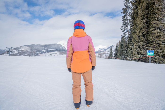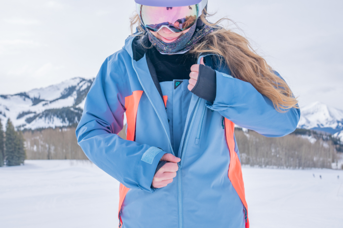 With a 20K/20K waterproof-breathable rating and CO DWR finish — which is PFC-free — this textile holds up against wet storms and high-output laps, as we discovered while riding at Crested Butte Mountain Resort in stormy conditions. The slim fit doesn’t sacrifice mobility, and we noticed that bit of stretch, too. Inside, the liner is strategically body-mapped, and shaping darts are integrated into fabric sections to enhance articulation and support movement. As a tailored cut, the jacket skims the chest and hips for a flattering profile. We loved this fit: The jacket never felt like it was a cavern, far away. And no matter how hard we were bootpacking up steep slopes or weaving around moguls, the jacket never felt restrictive.