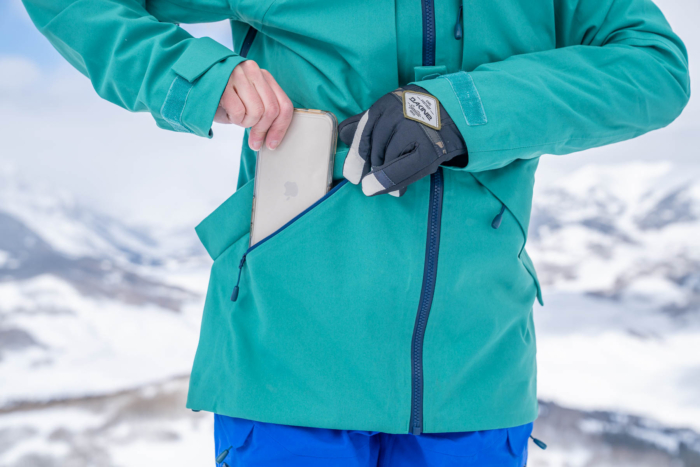 Deep, wide, higher-placed exterior pockets — like a chest pocket — can be a great spot to store a smartphone or notebook in the backcountry or on the lift. Putting heavier, bulkier items in the lower-placed hand pockets can sometimes smack against the upper thigh while hiking uphill, sitting on the lift, bending over to reach your boots, or making aggressive downhill carves.